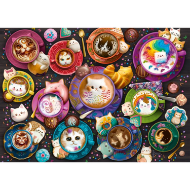 By artist Brigid Ashwood, this image features an array of rainbow cups and saucers filled with lattes that are topped with latte art of all different kinds of cats. Around the lattes are a variety of cat-shaped pastries