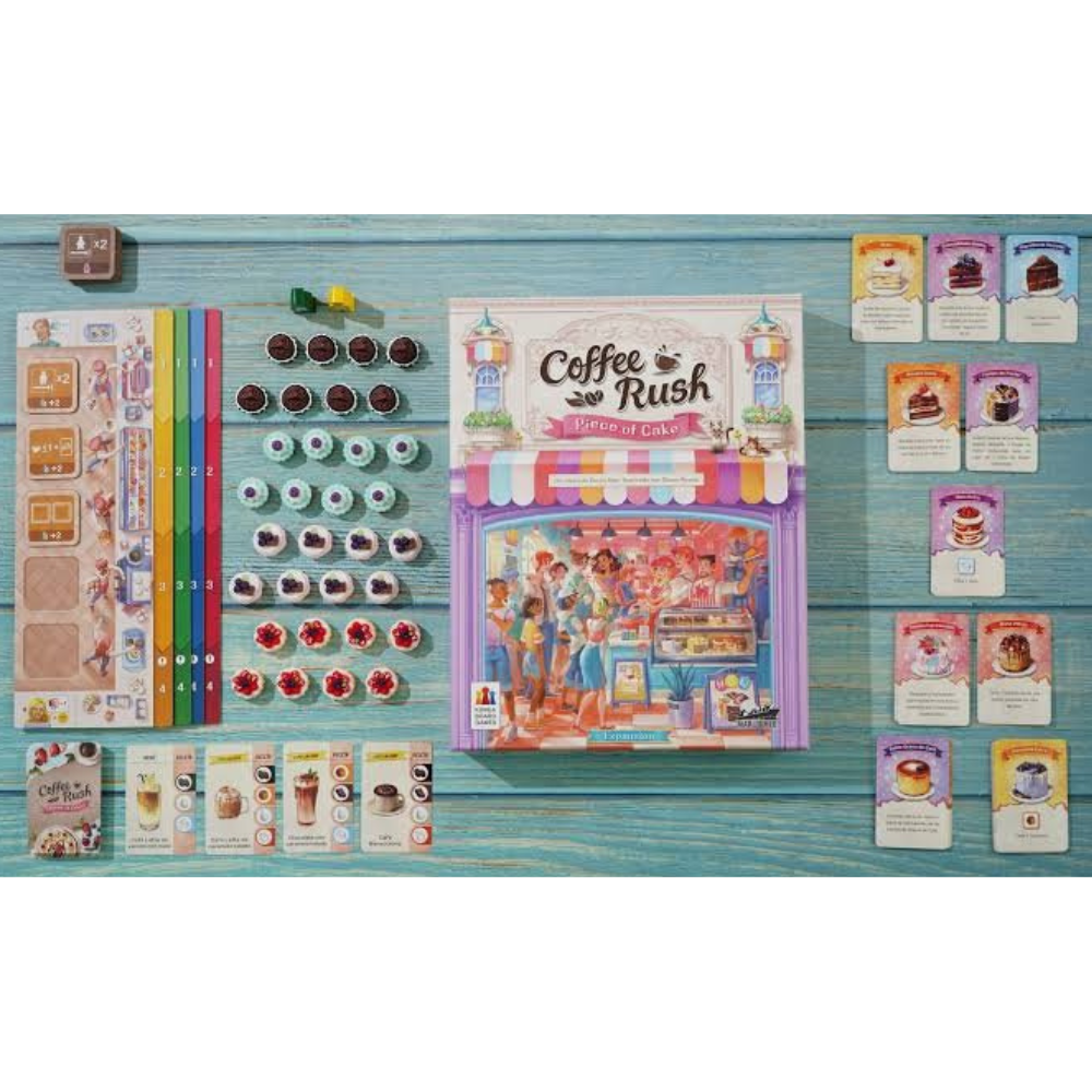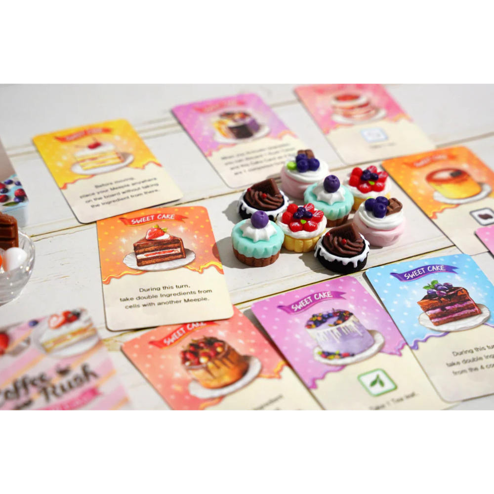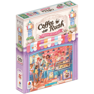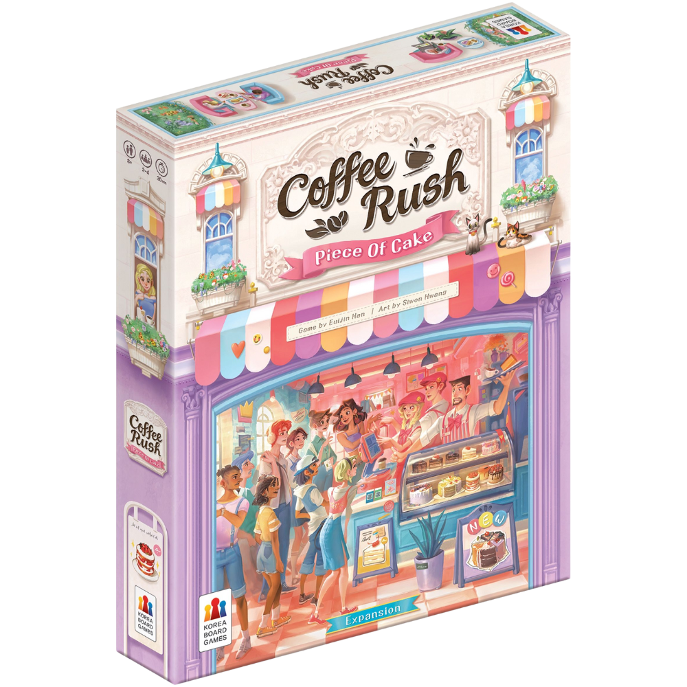The Coffee Rush: Piece of Cake expansion has players fulfill new orders with the help of cake cards. It adds new player boards, new order cards, beautiful 3D cakes, and new upgrades.