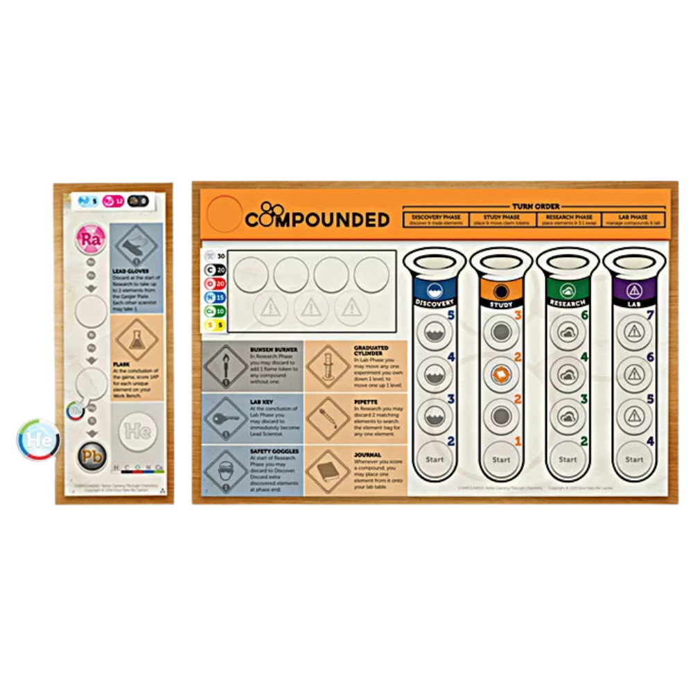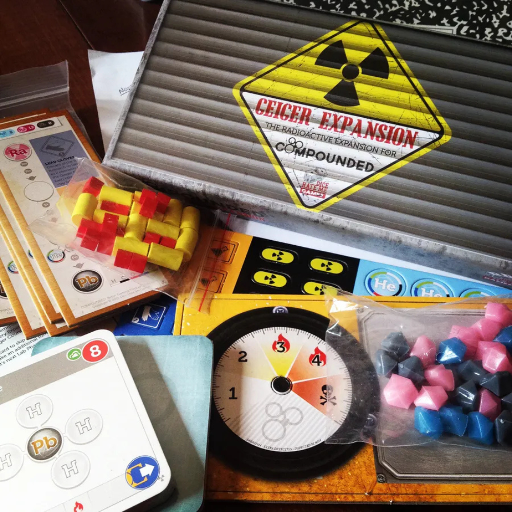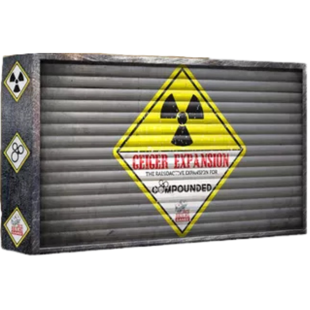 Compounded: Geiger Expansion, the first full expansion for the chemistry board game Compounded, gives experienced scientists even more to consider in the lab with the introduction of radioactive elements and compounds. As productivity in the lab increases, so does the chance for radioactivity levels to rise. Scientists have to keep a close eye on the geiger counter or else risk the lab becoming too radioactive in which to work.