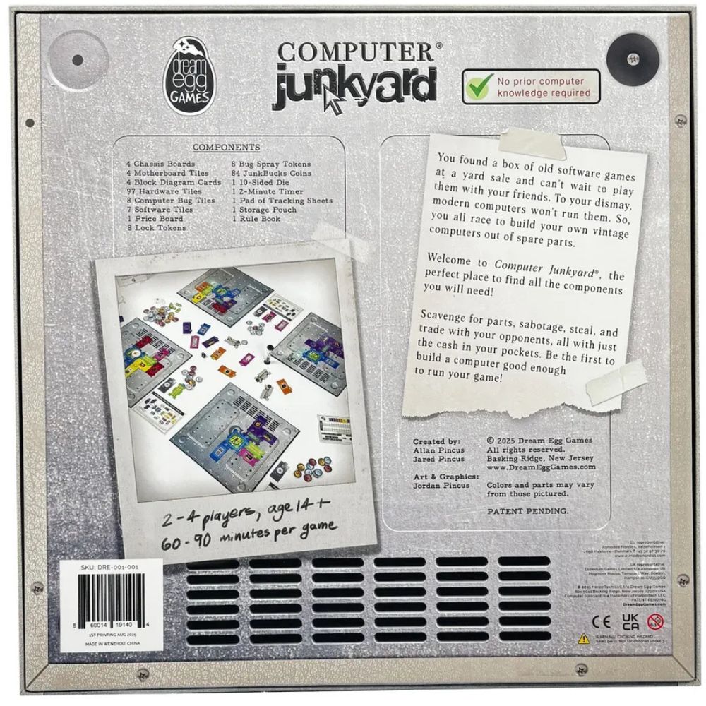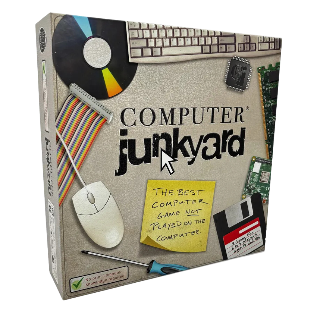 In Computer Junkyard, players assemble hardware tiles to construct a vintage computer. The first player to have a complete, bug-free computer, which meets the specifications necessary to run their unique computer game, is the winner.