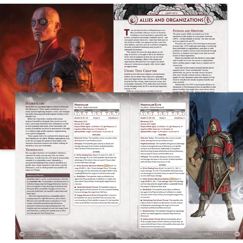 A beautifully illustrated and in-depth guide to Mistborn and the world of Scadrial. The 285-page Mistborn World Guide covers both lore and legend from Mistborn Era 1 and Era 2, allowing you to flesh out a campaign in either setting OR just enjoy the guide as an art book for the stories.