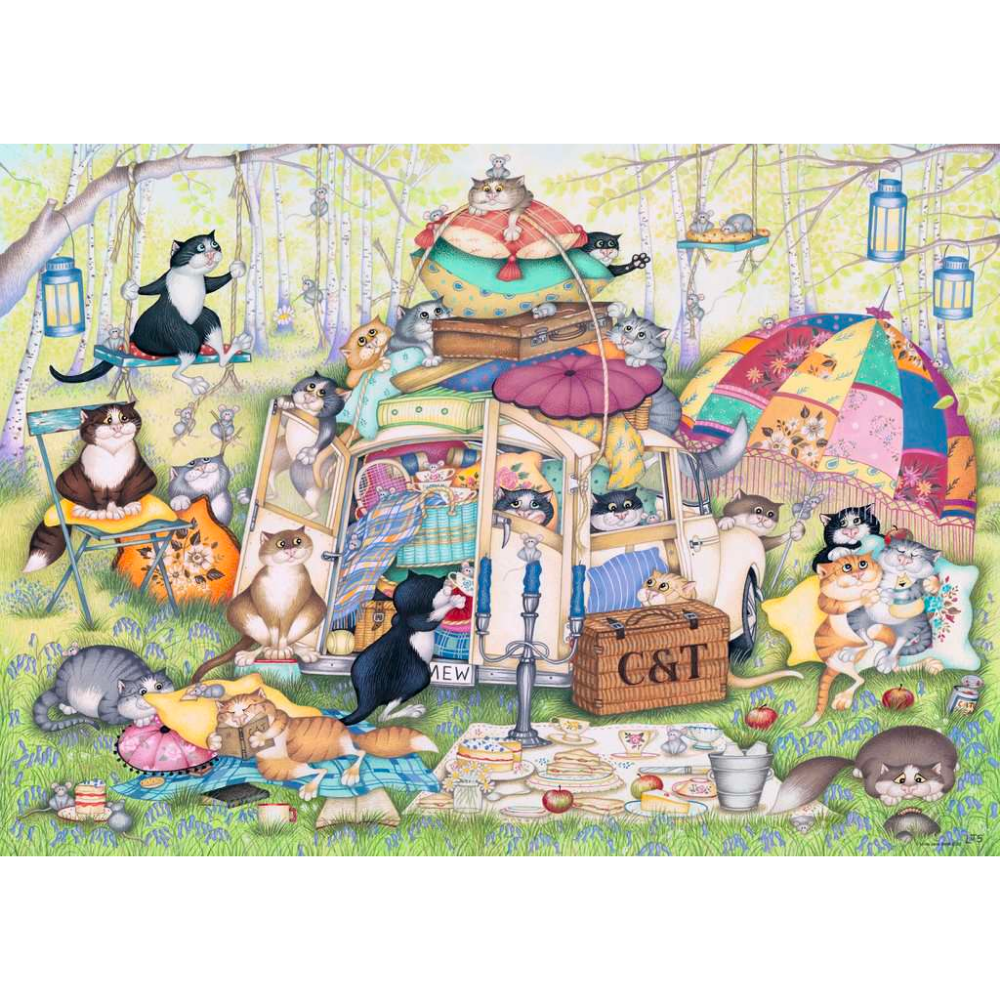 These Crazy Cats have everything they need for a great afternoon in the countryside. They’ve chosen a lovely spot amongst the birch trees, have brought every possible home comfort and even a few mice friends to keep them company. We love the fabulous vintage fabrics and wonderful detail in this colourful scene – there’s so much to discover and enjoy!