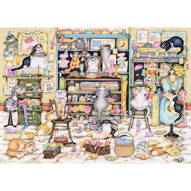 Immerse yourself in the world of "Crazy Cats Haberdashery" with this captivating 1000-piece puzzle. Every piece brings you closer to unraveling a tapestry of feline frolics and mischievous mayhem, all set within a charming haberdashery that cats have claimed as their own.