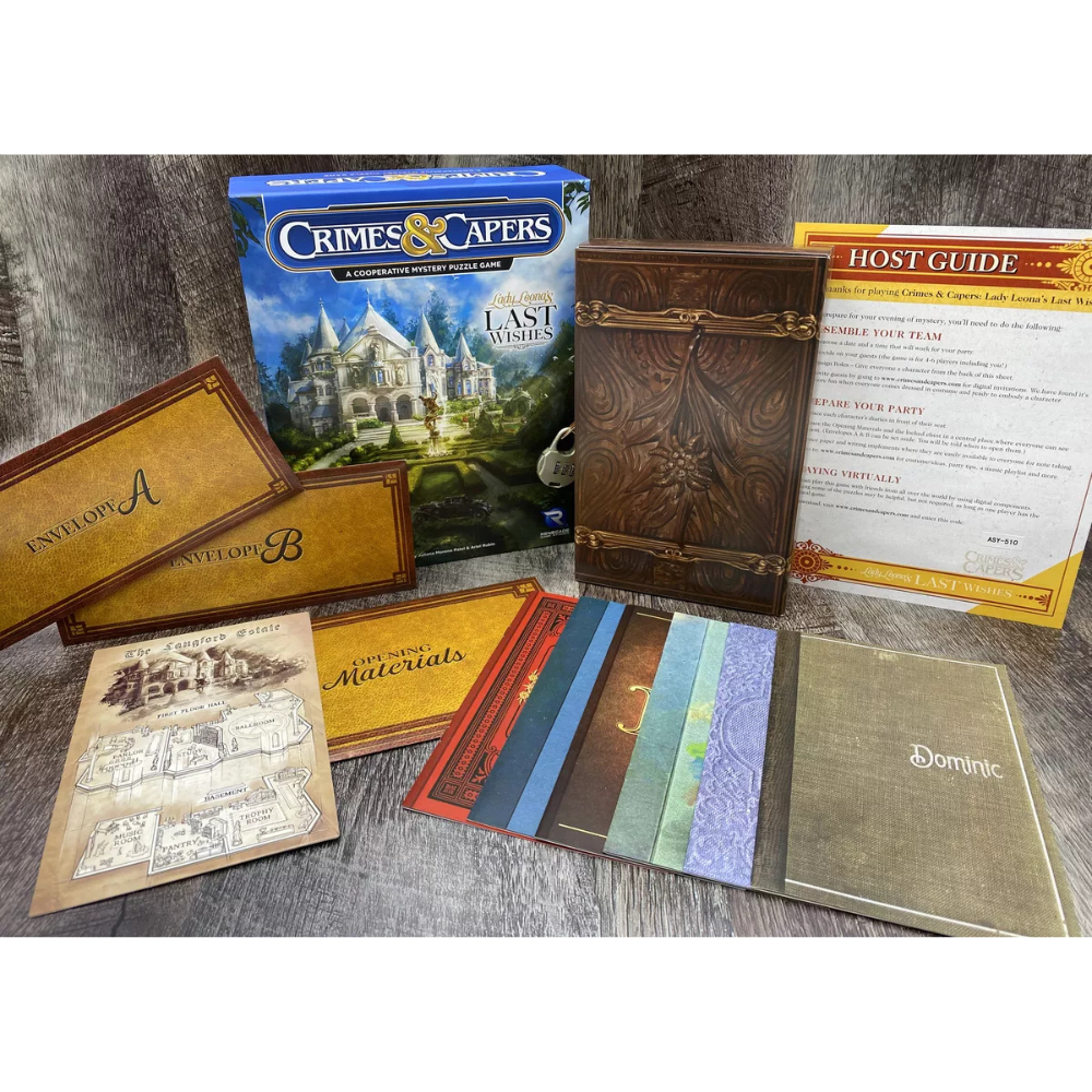 Crimes & Capers: Lady Leona's Last Wishes is a cooperative game where you and a group of friends will take on roles of polished high society folks and hand working servants who need to collaborate to solve the mystery and find Leona's treasure. No special skills or prior knowledge are required. Read the notes, figure out puzzles, and unlock the answers to find out where Leona hid her fortune!