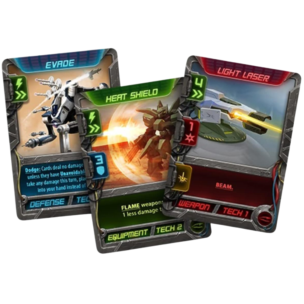As cards are played, they go to their owner's cool-down pile, where they remain until they're reloaded. As players take damage, the armour on their mech is destroyed. When enough armour is destroyed, an armour core becomes vulnerable and can be destroyed to stun that mech for the next turn. The game ends when a mech's armour is completely destroyed down to the last core.