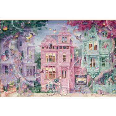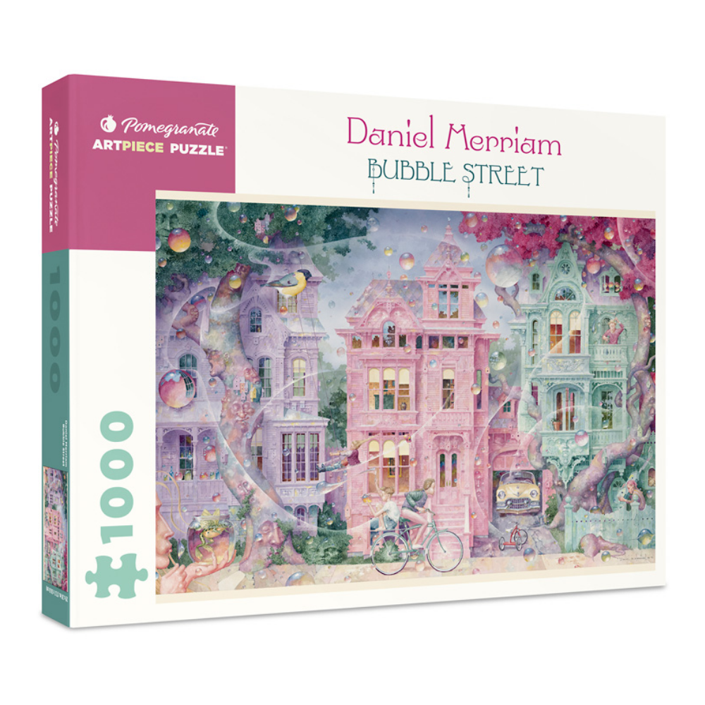 Daniel Merriam’s surreal artworks combine a romantic Victorian sensibility with a dreamlike imagination. Bubble Street is one of his fantasy-fueled paintings, in which riotous colour presents a neighbourhood street filled with bubbles, odd creatures, an old-timey car, architecturally magnificent homes, and children enjoying a swing and a bike ride. there’s much, much more in this visual feast, reproduced for this 1,000-piece puzzle.