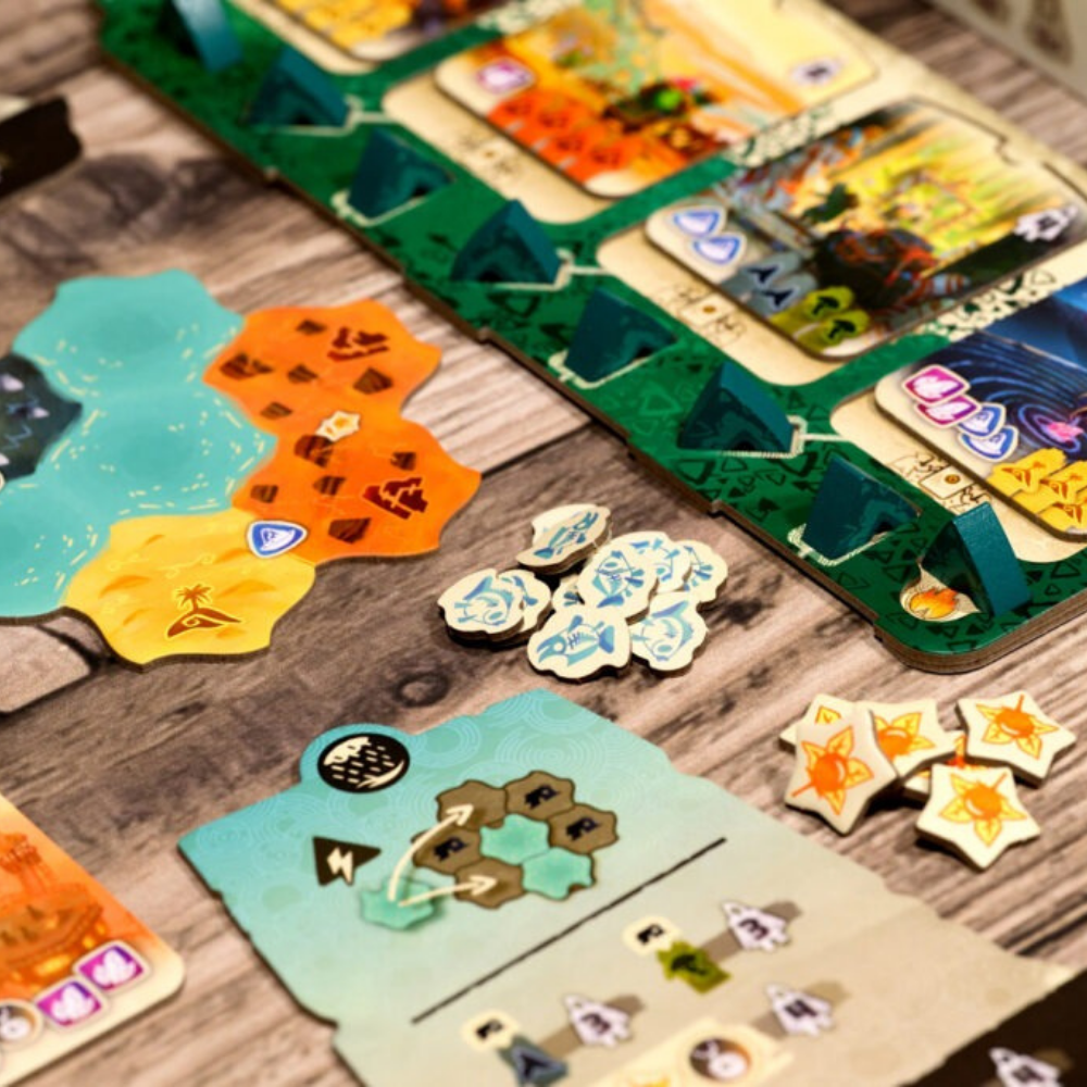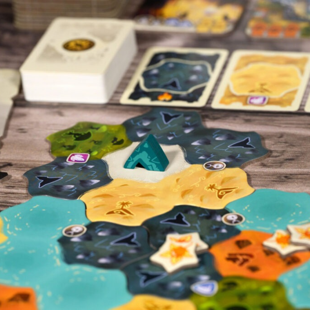 Dewan is a fast-paced, competitive area-placement game for 2-4 players that features racing, placement, and hand strategy. During play, you collect terrain cards and spend them to strategically place your camps on the territory. Make the best use of terrain and resources so that you can satisfy the requirements on your story tiles. Along the way, gather berries and master fire to earn additional points.