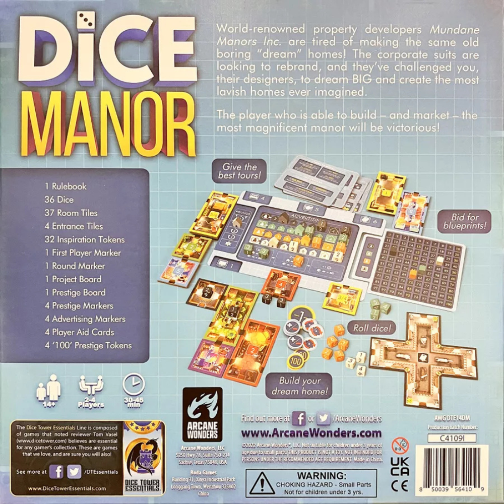 Over four rounds, players will use their dice to bid for blueprints, earn advertising space, collect Inspiration tokens and give early tours of their manor. All leading up to the final round where it's time for the Grand Opening of their completed manors - in the hopes of earning the most praise from the community. The player who gets the most prestige (Victory Points) is the winner!