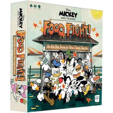 A nostalgic invitation to play inspired by the Mickey Short “No Service”! It’s a carefree day at the beach with your favourite Disney friends, until a lunchtime food fight ensues! Get in on a chaos of concessions by tossing different dishes and treats from the Snack Shack to clear your tray the fastest! Simultaneously roll dice and follow what types of food to toss, how many, and in which direction… while avoiding others’ food! Empty your tray and be the first player with three Mickey Medals to win the Mickey and Friends Food Fight!
