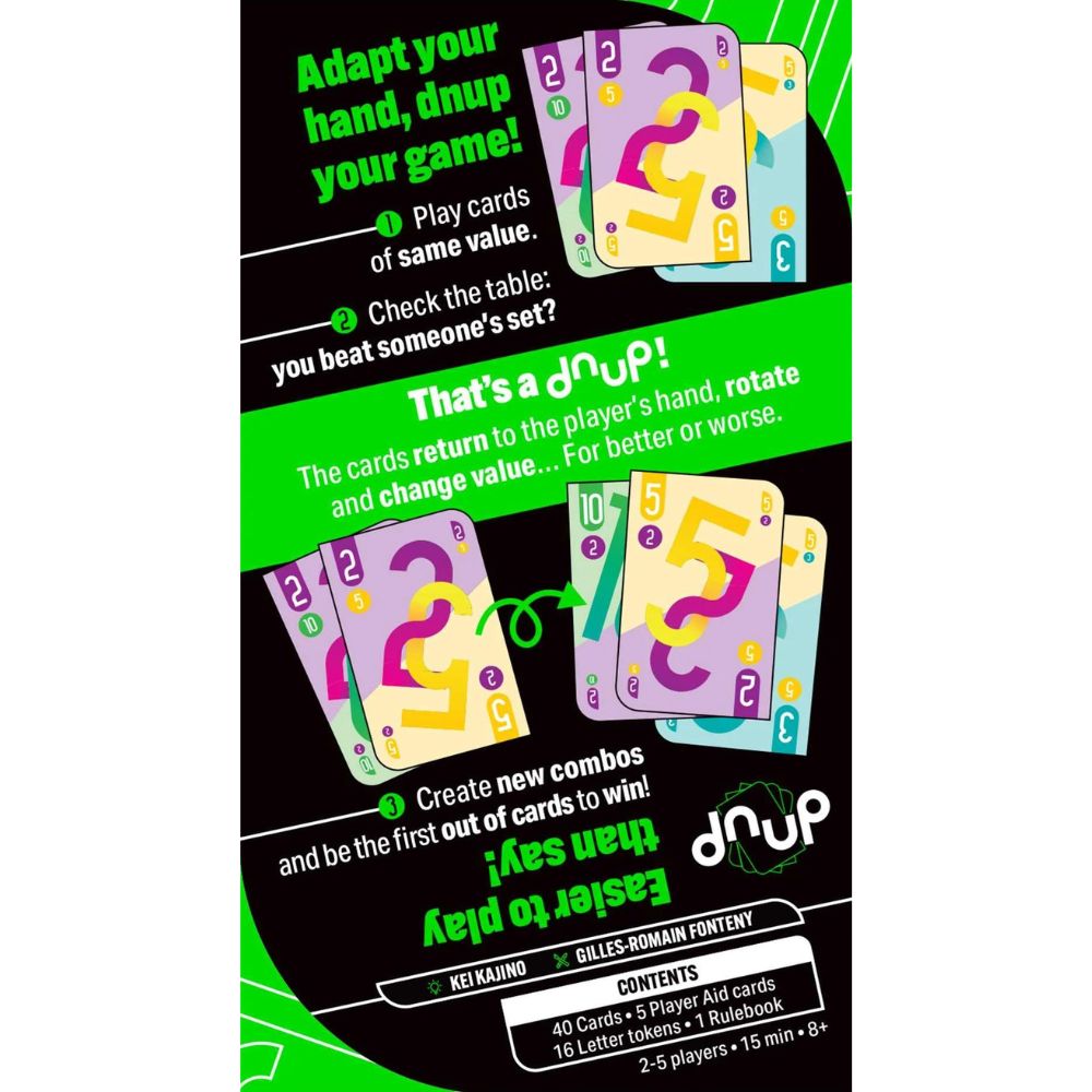 Players score points as they empty their hands, and the first to reach four points wins the game. With simple rules but plenty of tactical twists, DNUP is a quick, engaging card game where every move can turn the tables.