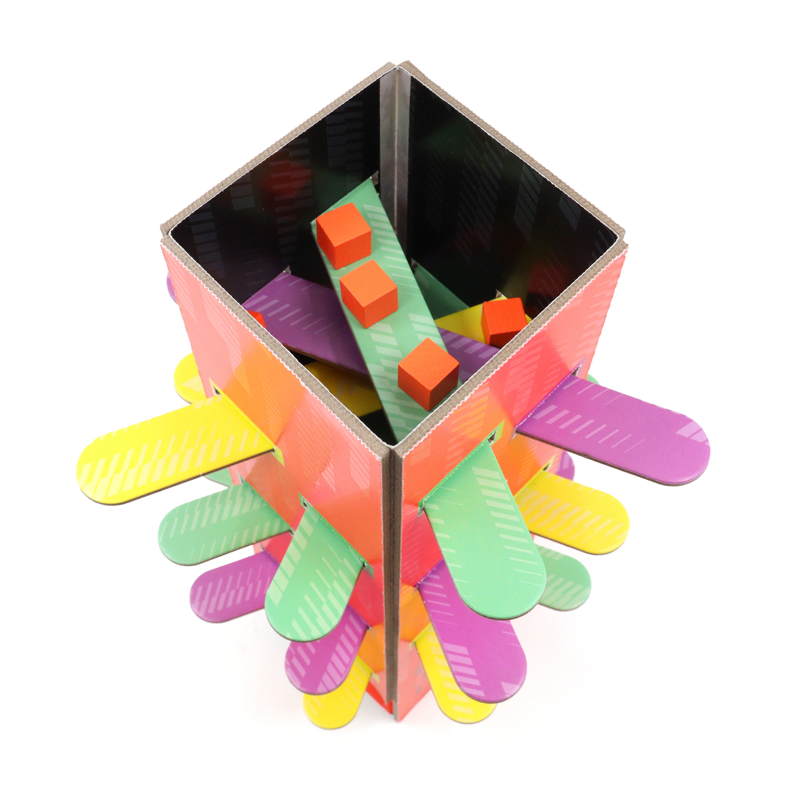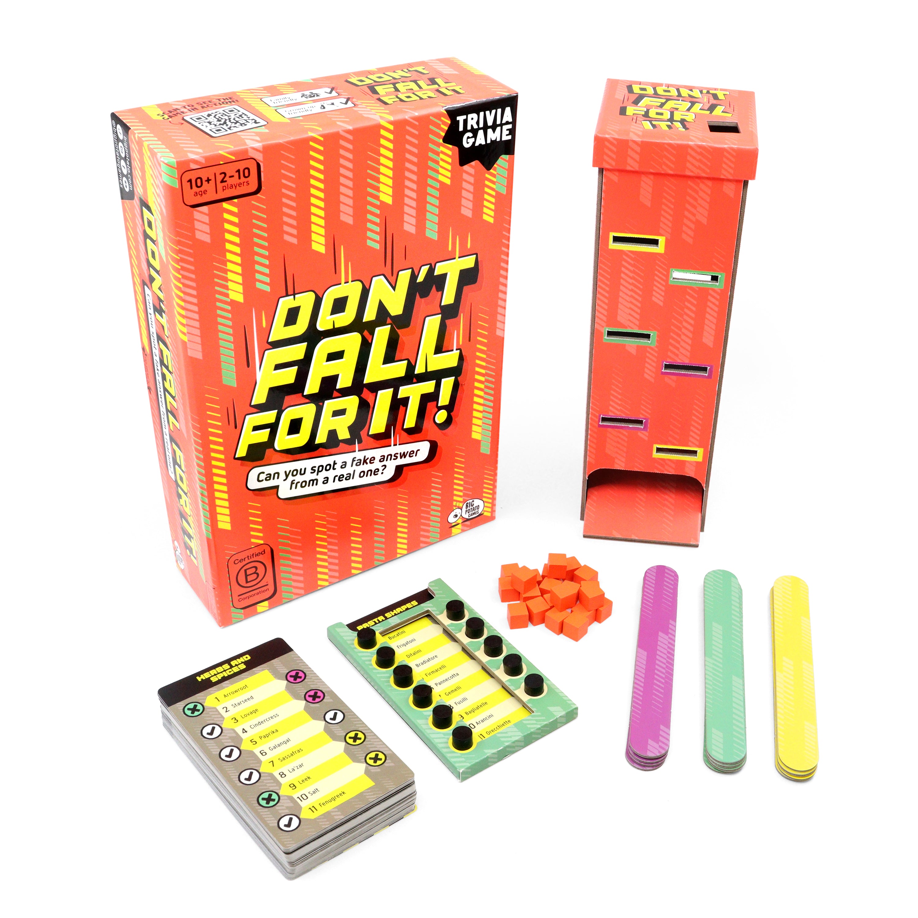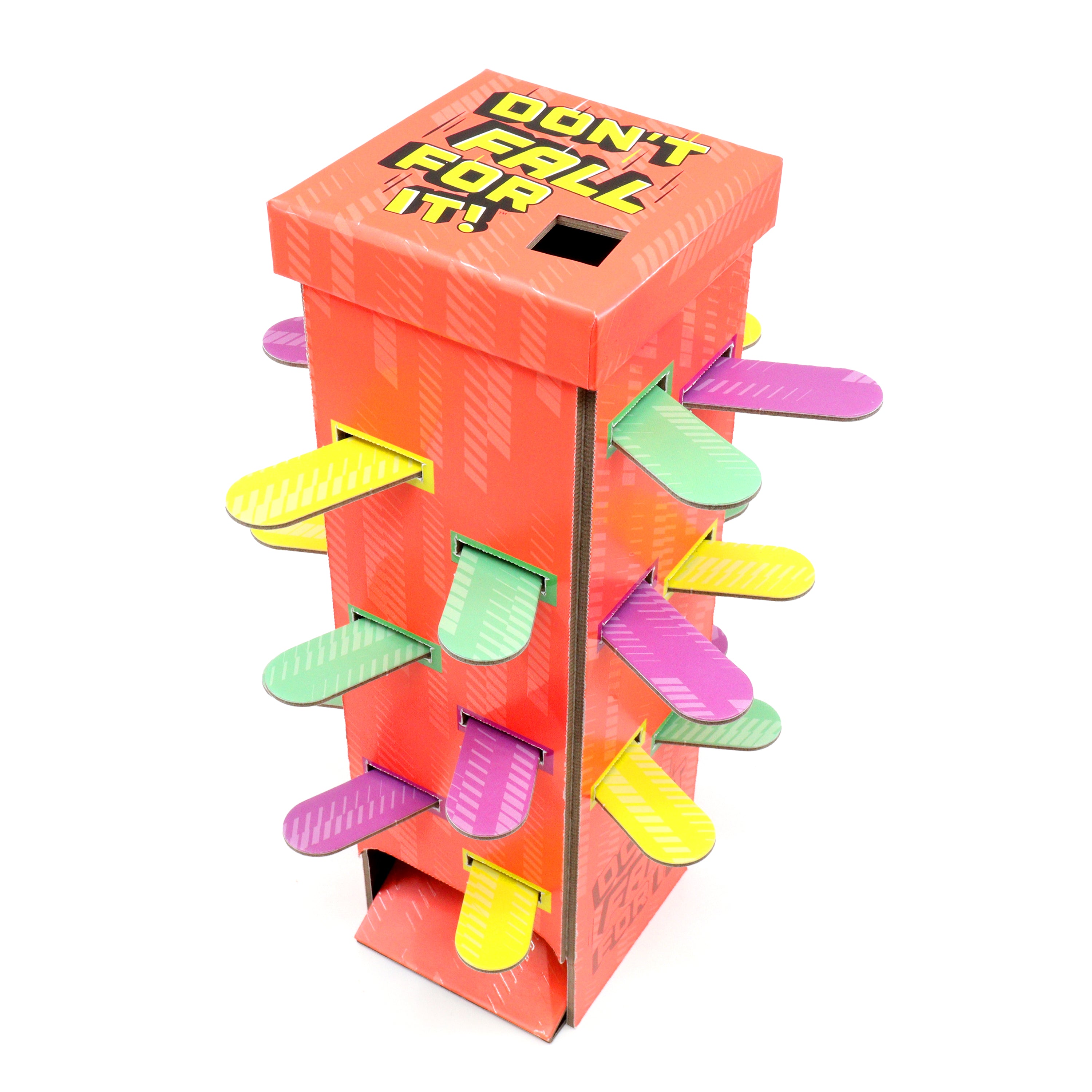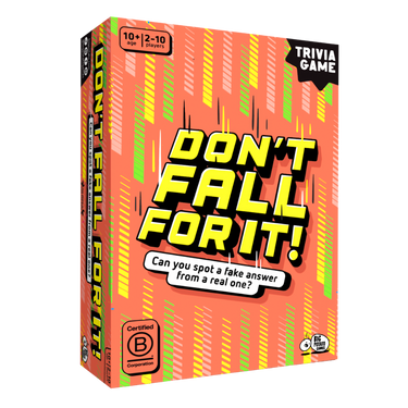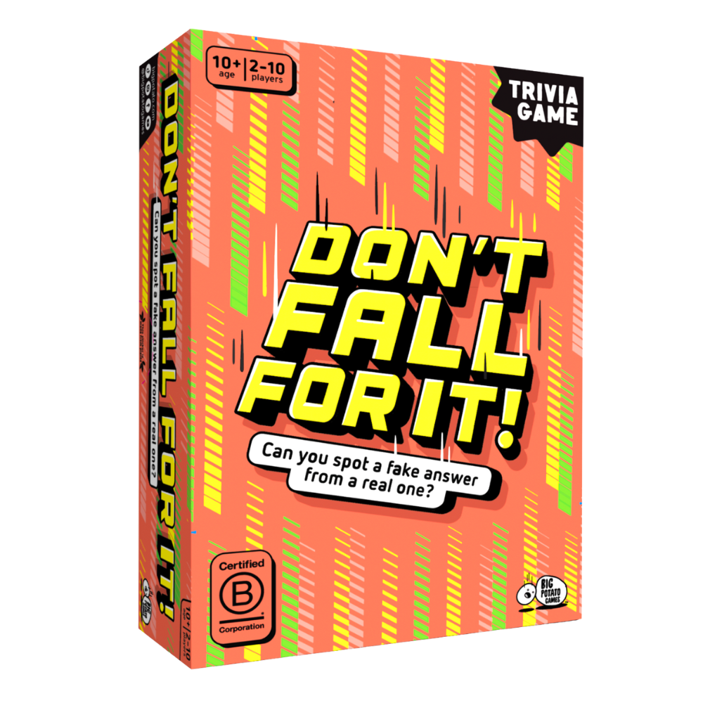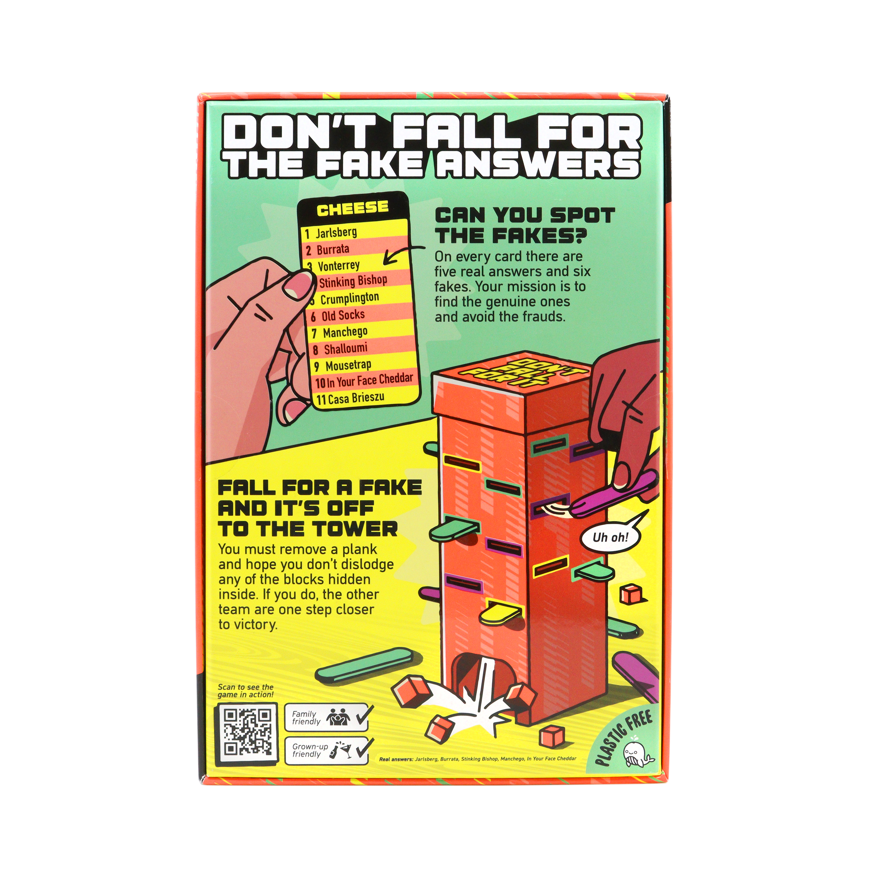 Don’t Fall For It is a trivia game with boobytraps. On every card there are five real answers and six fakes. Your team’s mission is to find the genuine answers and avoid the frauds. Pick a fake and it’s off to the tower with you. There you must remove a plank, hoping not to dislodge any of the wooden blocks hidden inside. If any fall, you’re stuck with them. The first team to get lumbered with 11 blocks is out and the other team wins.