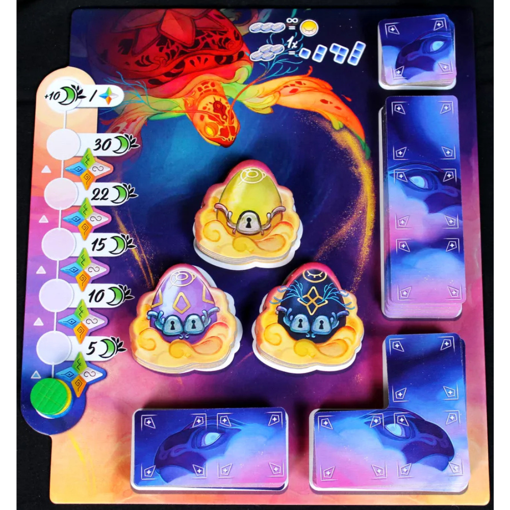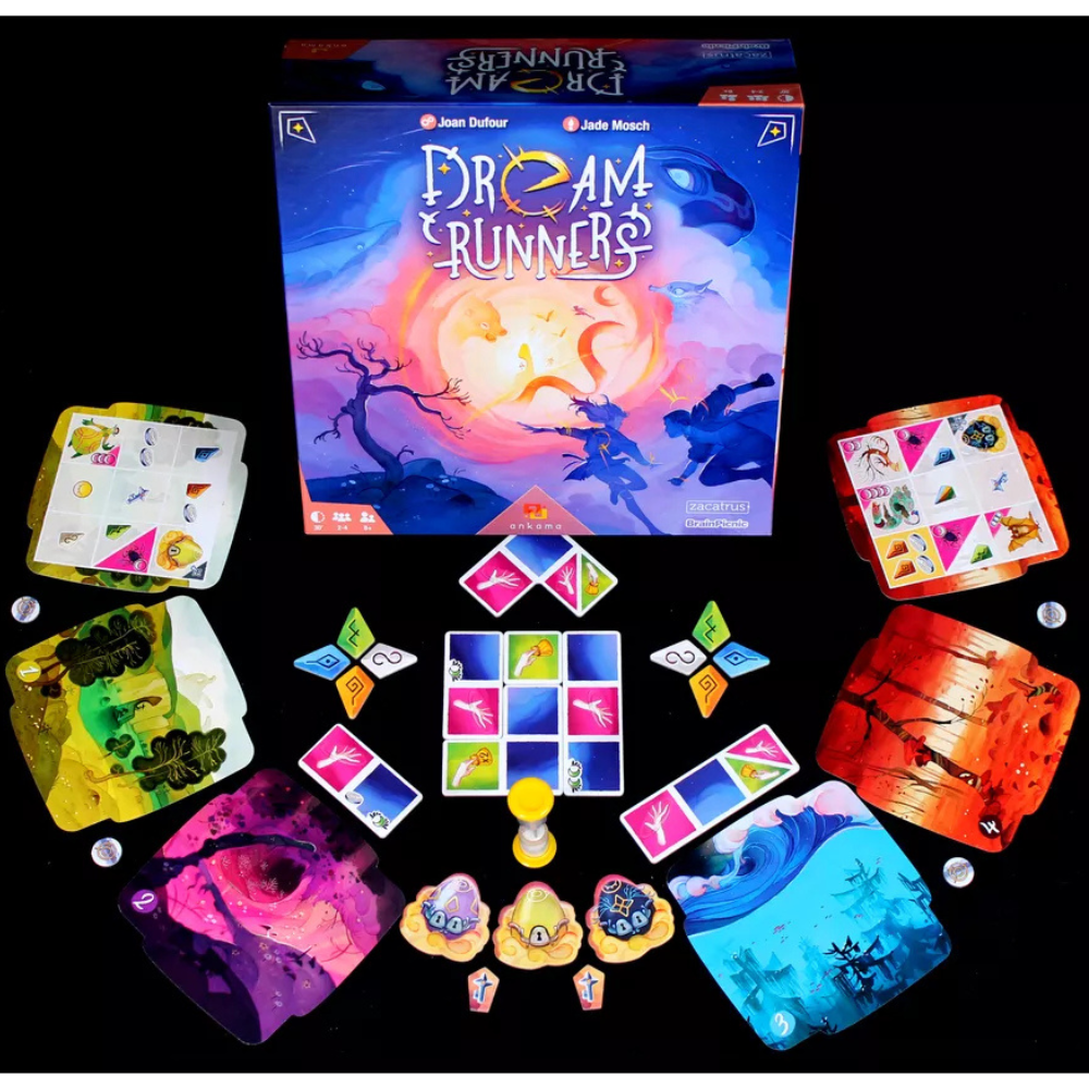 In Dream Runners, players are presented with a common dream tile each turn. Using their individual segmented tiles, they’ll have to create a pattern where action symbols match the position of trials of the dream: banishing the nightmares away, collecting coins to purchase new segments, keys to open chests and star fragments to earn more victory points. In return, every trial that is not covered with a symbol will diminish your serenity, decreasing your final score.
