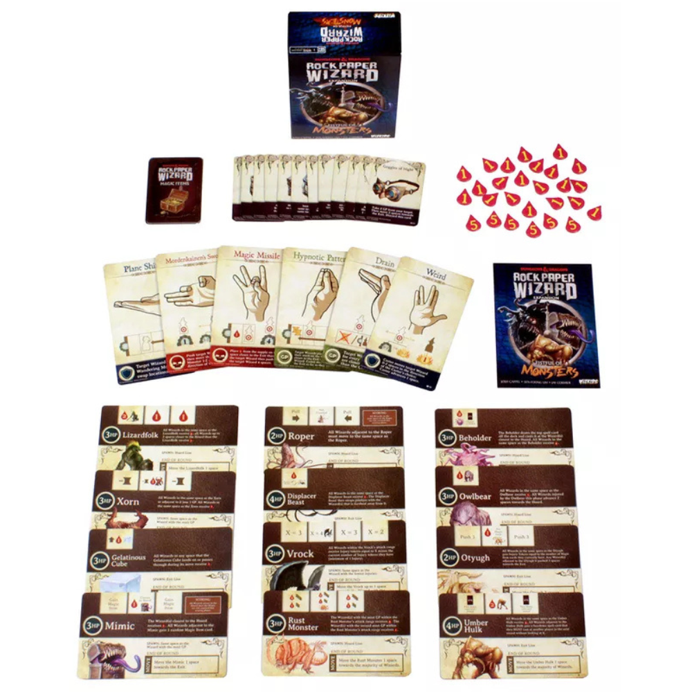 In this expansion for Rock Paper Wizard, a new threat has entered the mix: the wandering monster. Each wandering monster has its own unique ability that's capable of forcing a wizard to move around the board, lose gold, or even take an injury token.