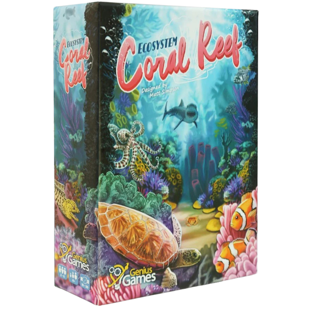 Dive deep to build your own ecological network in Ecosystem: Coral Reef, a card-drafting game of marine competition. Players choose, pass, and arrange cards representing a diversity of organisms found in the Great Barrier Reef, including coral, clownfish, sea turtles, and sharks. Earn points by aligning animals with the habitats and food sources where they most flourish. Diversify your food web to maximize your bonuses. Each time you play, you build a one-of-a-kind ecosystem as you strive to balance the delicate connections between all living things.