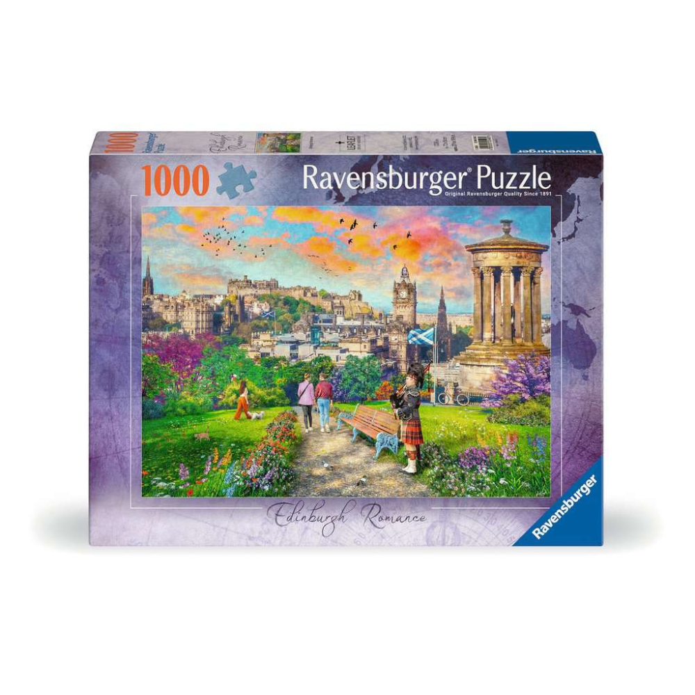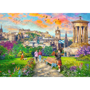 Edinburgh’s skyline takes centre stage in this stunning view from Calton Hill. The city’s ancient fortress stands proudly atop Castle Rock, the magnificent Balmoral Hotel dominates the middle ground, and on the right sits the memorial to Scottish philosopher Dugald Stewart. A couple enjoy a romantic stroll, a lady takes her dog for a walk and a piper practises his pipes. Colourful flowers, shrubs and trees combine with the early tones of sunset to bring rich, vibrant tones to this much-loved view.