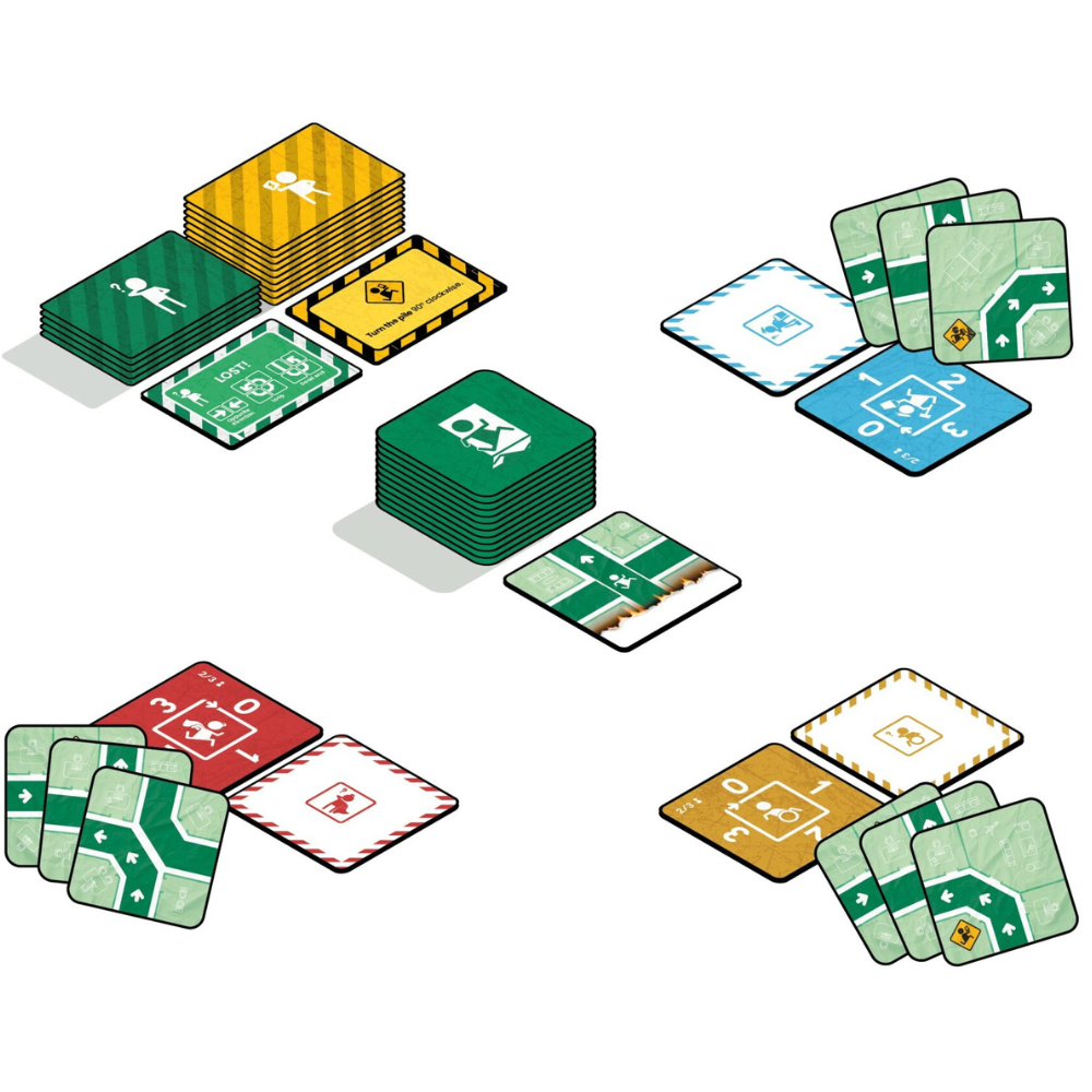 In Emergency Exit Only, each player in turn will play a tile to advance to the exit. But you’ll be playing the tiles on top of each other, so you’ll be putting your spatial visualisation skills to the test! Memorise your escape route and make your way through the building together. Play your “Lost tile” when you think you’re lost and the path is dead-end. At the end of the round, lay out your escape route and find out who survived to score points! Start a new round and add one more constraint to add even more panic to the table!