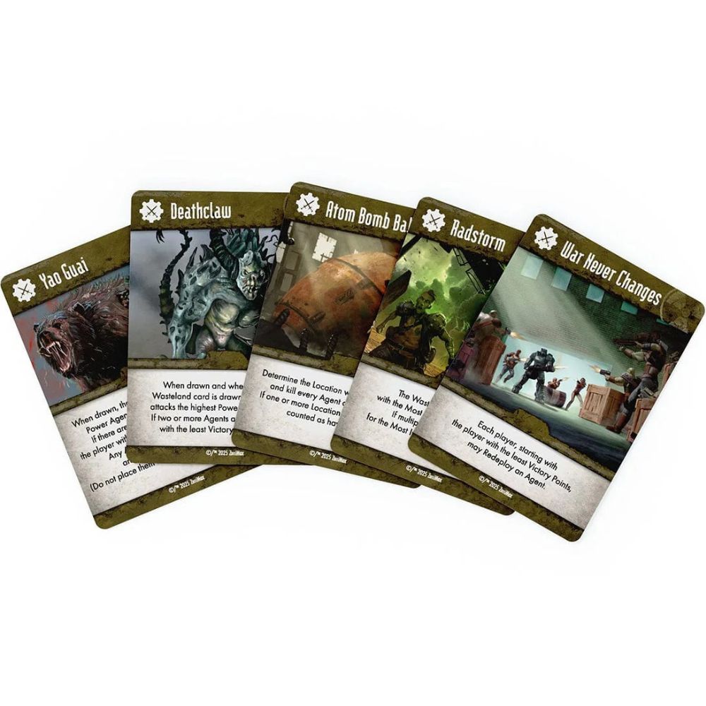 You will spend your turns attempting to gain the most influence in locations on the board, winning points at the end of each round for each location where you have the most influence. To gain influence, play agents into locations, play and complete quests (which come with other rewards as well), use "power play" cards to respond to opponents, and struggle against the Wasteland itself as each turn a randomly drawn card brings an unpredictable change to the game, from sudden atomisation to a surly deathclaw rampaging through your home base. The first player to gain 10 points wins.