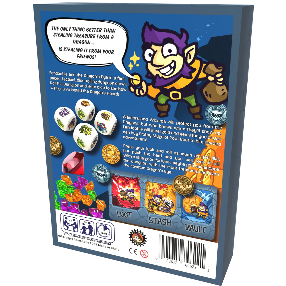 Fandooble is a wildly fun and fast party game. Race against your opponents to steal all of the gold from the fearsome dragon. Wizards and knights will help you along the way, but your never know when they’ll show up. Keep and eye on that rascally scoundrel Fandooble though; he’ll steal your hard stolen gold and give it to someone else before you can say, “Don’t steal my gold, rascally scoundrel Fandooble.” Watch out, though – roll three dragons and you lose the gold you just stole; roll three red fire-breathing dragons, and you are really out of luck!