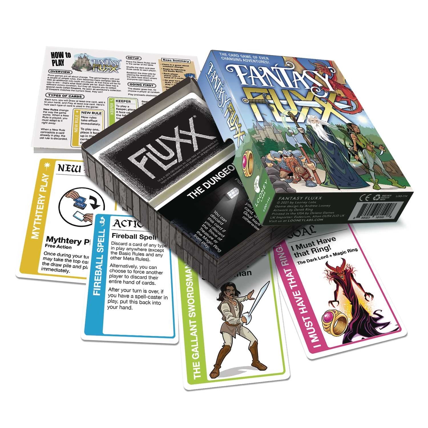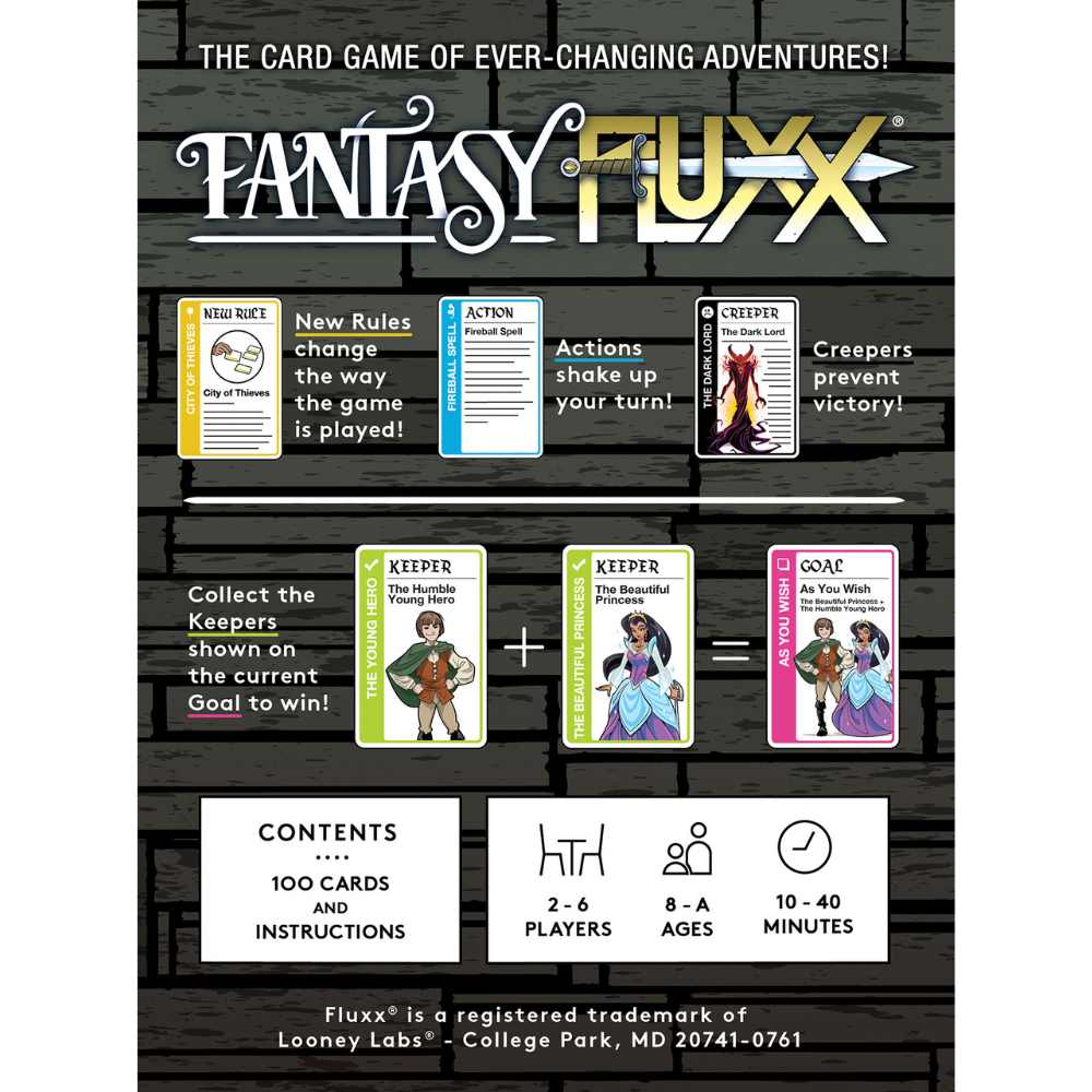 Gather your friends for a party – an adventuring party, that is! Set off on a classic quest with your faithful companions: the Helpful Elf, the Dwarven Warrior, the Gallant Swordsman, and, of course, the Wise Old Wizard. Learn from the Cranky Magic Teacher how to use your Wand to cast spells like Invisibility or Fireball! You may need them as you encounter the Dreaded Pirate, or when you find out that the Captured Princess is actually the Mother of Dragons! Will you and your fantasy favorites survive the Final Showdown with the Dark Lord? Find out when you play Fantasy Fluxx!