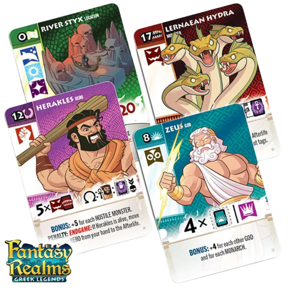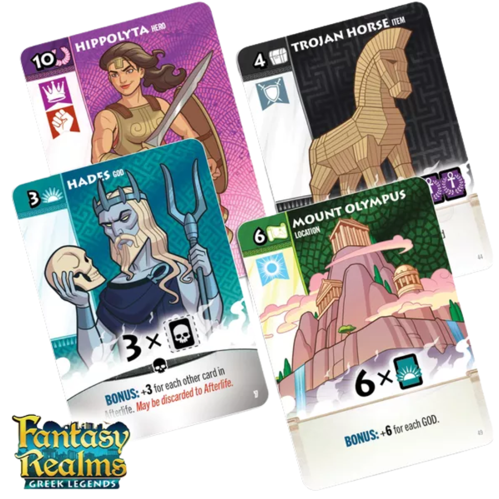 Fantasy Realms: Greek Legends takes the classic Fantasy Realms formula and adds new twists to match its theme. In addition to combining the right suits and attribute tags, you will: