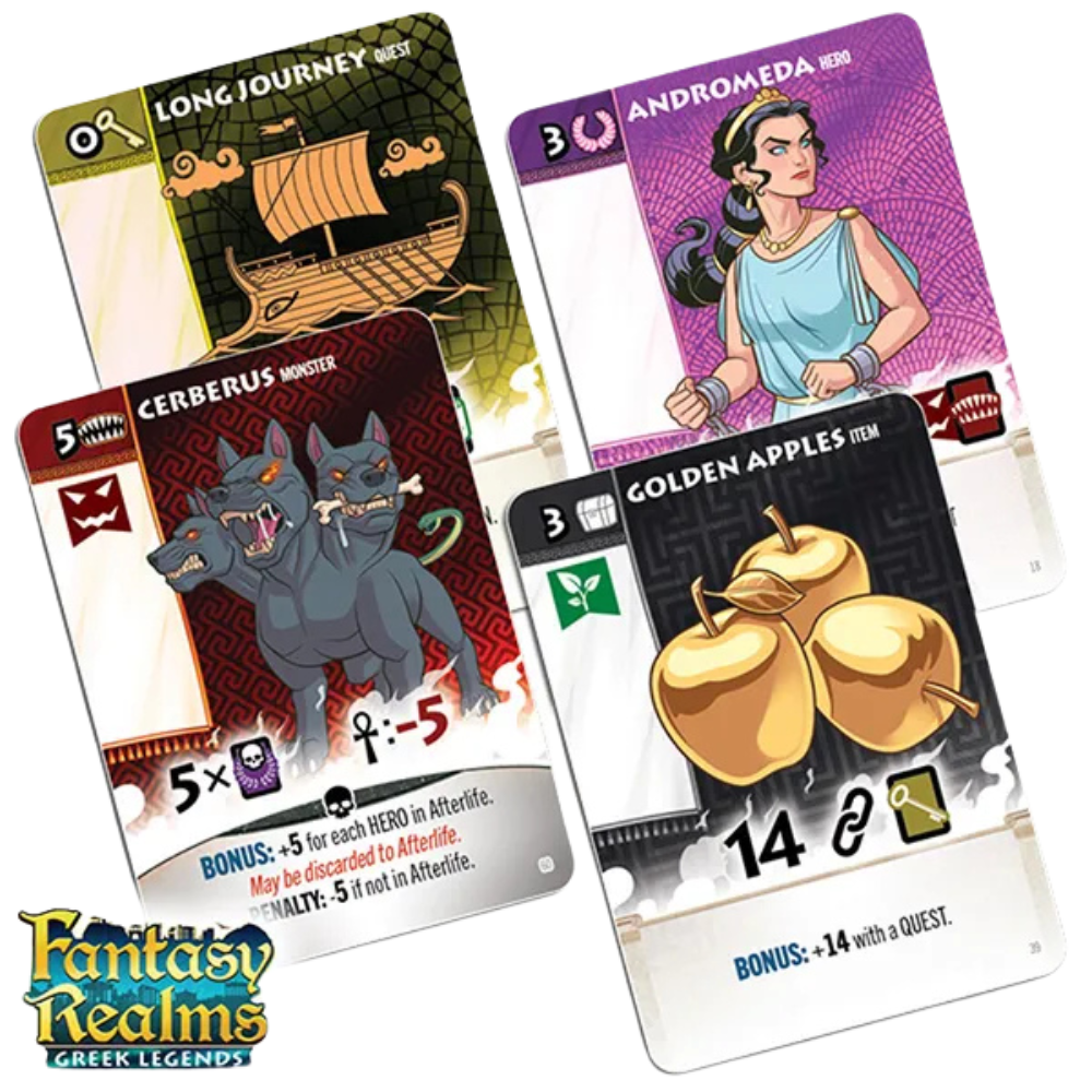 In the standalone card game Fantasy Realms: Greek Legends, you build your realm, one card at a time, as you collect heroes, quests, monsters, and more! Each card is unique, and scores points based on the other cards in your hand. You start with seven cards, and each turn, you draw a new card from the deck or discard area, then discard one card from your hand, always trying to improve your realm. Whoever's realm scores the most points wins.