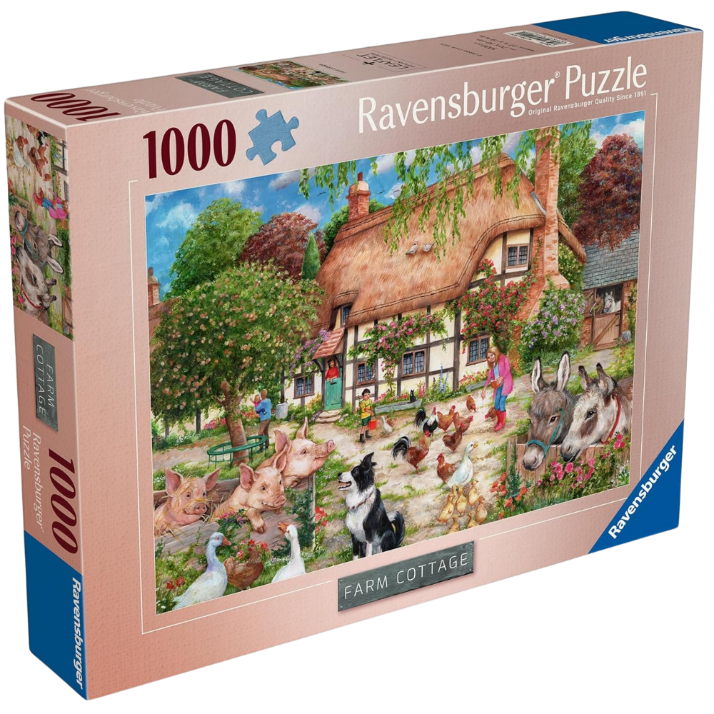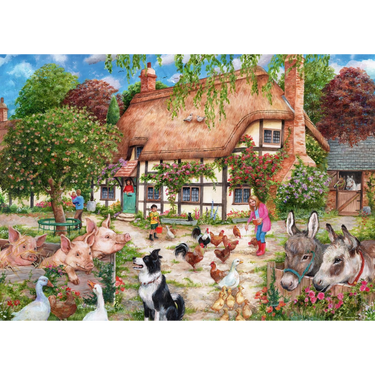 Experience the charm of rural life with this delightful 1000-piece jigsaw puzzle. The scene features a picturesque thatched farmhouse nestled in the countryside, surrounded by lively farm animals. A friendly dog sits on the pavement, while pigs, donkeys, and chickens roam freely, adding to the warm, rustic atmosphere. As you piece together this heartwarming image, you'll be transported to a simpler time, where nature and animals live in harmony.