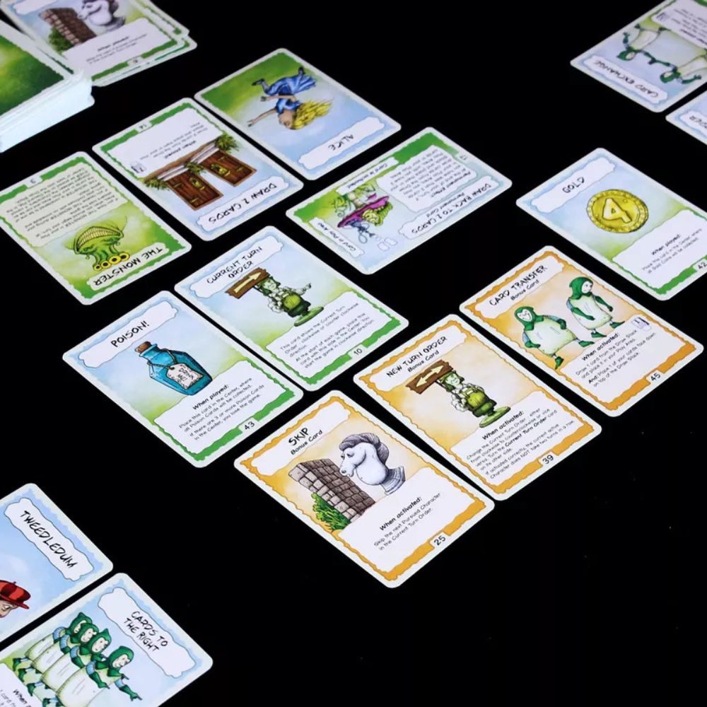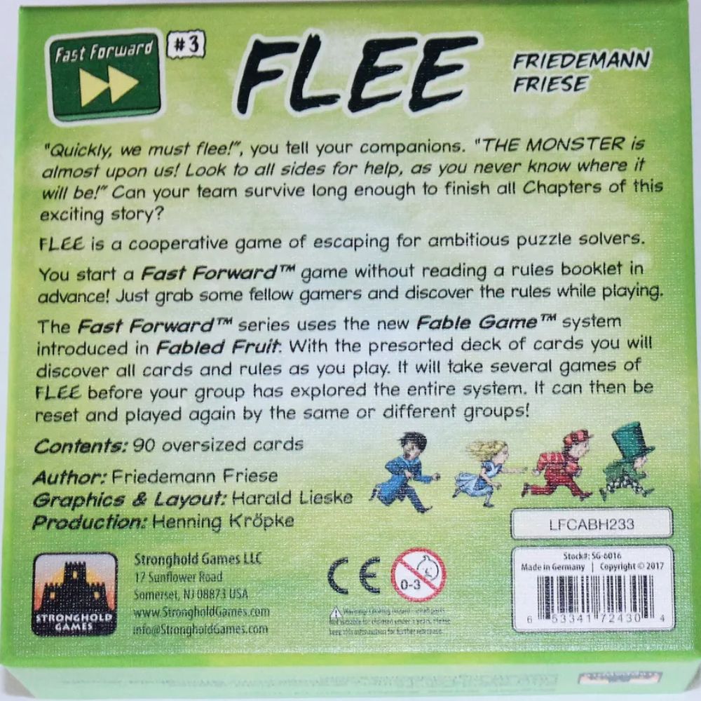 You start a Fast Forward game without reading a rules booklet in advance! Just grab some fellow gamers and discover the rules while playing. The Fast Forward series uses the Fable Game system introduced in Fabled Fruit: With the presorted deck of cards you will discover all cards and rules as you play. It will take several games of FLEE before your group has explored the entire system. It can then be reset and played again by the same or different groups!