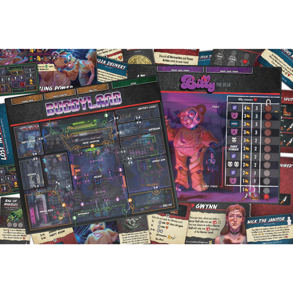 For years Billy Bear and his animatronic Buddies entertained kids and adults alike. Now Billy is out to kill you and anyone else in his path—and joining him might be one, two, three, or all seven Buddies... the variable setup will make it a surprise each time. Be sure to turn off Billy’s power supplies or he’ll just keep recharging. Good luck surviving the night!