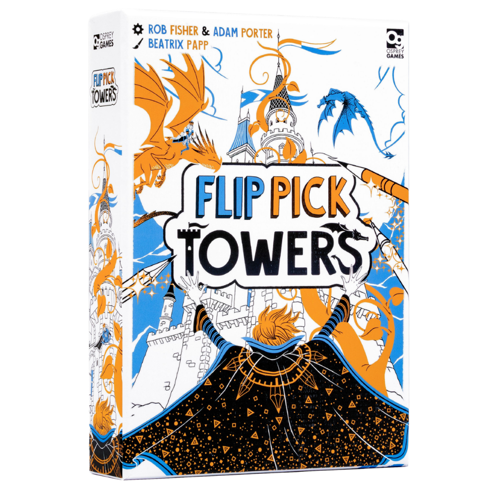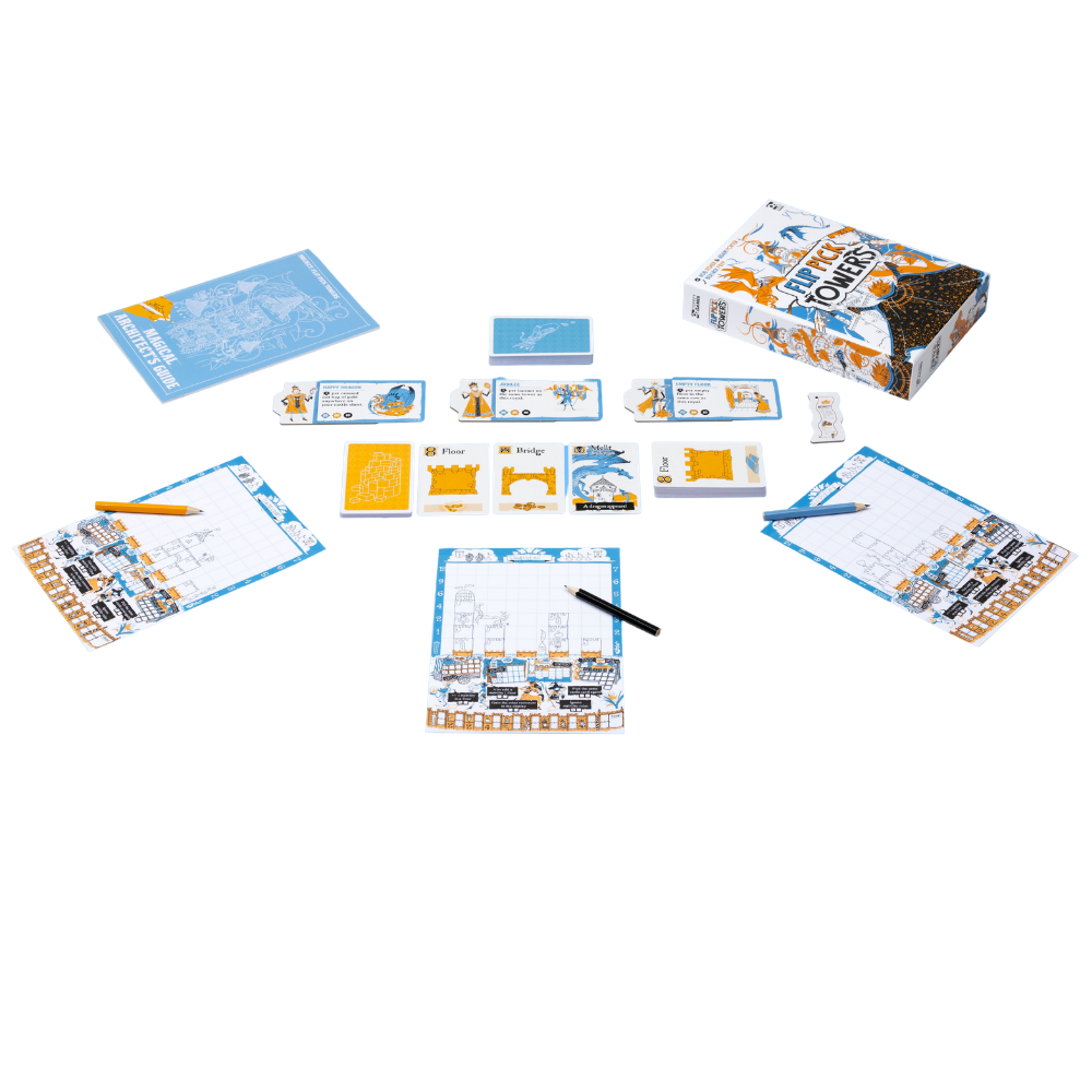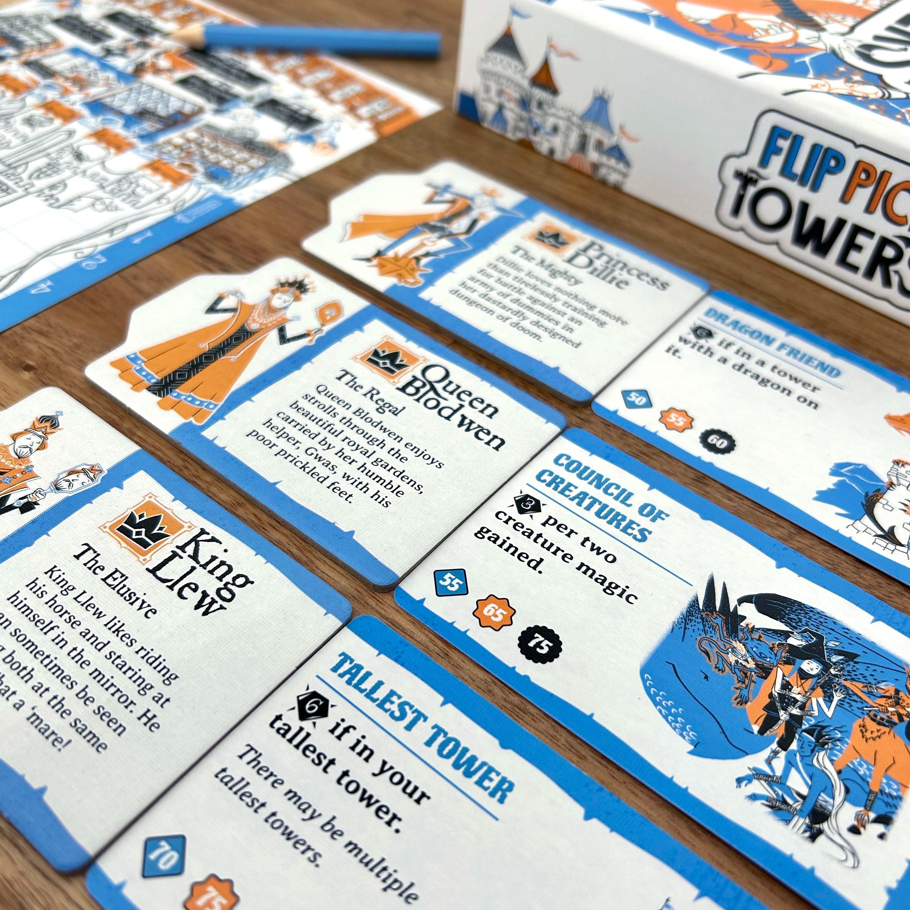 Flip Pick Towers is a drawing game where players illustrate charming, playful castles to meet demands set out by the fussy nobles who wish to move in. With a huge number of scoring objectives, victory lies in constructing soaring creations full of fantastic features and characters, all the while guarding against mischievous dragons seeking to halt your progress!