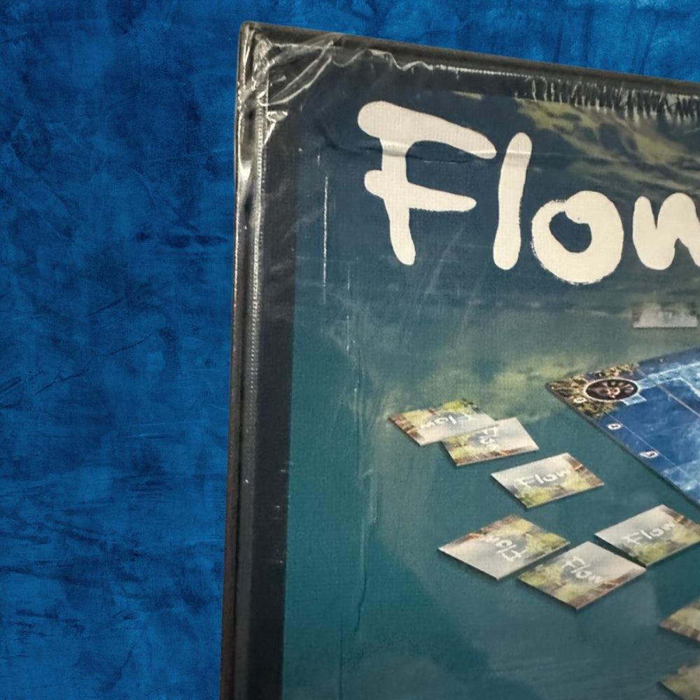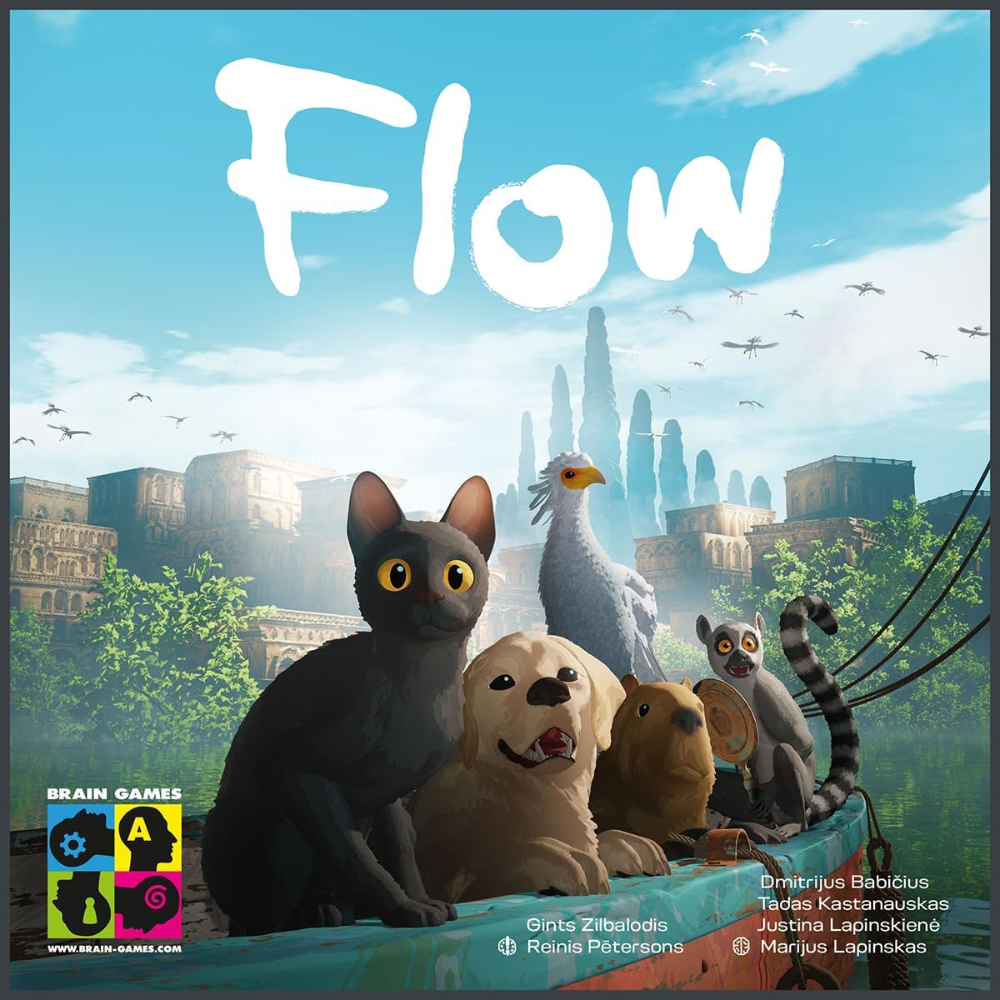Flow is a cooperative game where players work together to connect four animal spaces to the boat tile in the center of the board by drawing and playing tiles. If players run out of tiles they and the animals have not been connected to the boat, they all lose. On top of that the game uses a timer, and each time it runs out, players roll two dice that tell them where the giant wave strikes and washes away tiles already placed. Do you have what it takes to save the animals?