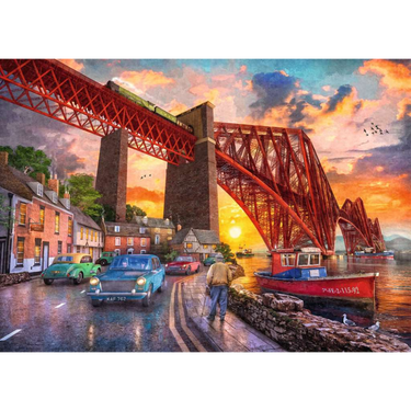The Forth Bridge is a Scottish icon, and was the world's first major steel structure. This atmospheric view captures the powerful red construction in the early evening, its famous cantilever arches reaching out across the Firth of Forth. Aside from the bridge itself, our scene depicts vintage cars gathering for a local "scramble", fishing boats awaiting their next trip out and a steam engine powering its way across the bridge after a day trip.