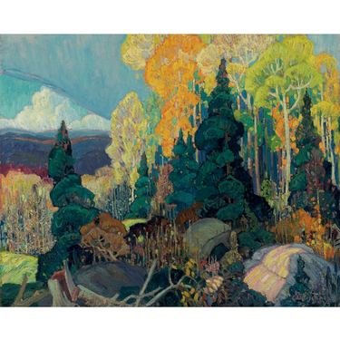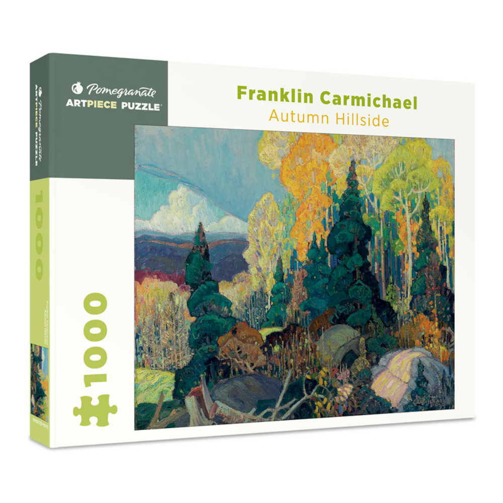Franklin Carmichael is well known as a fine artist in the Group of Seven, but he began his art career as a designer, graphic artist, and craftsman. His Autumn Hillside exemplifies his mastery of colours in a wooded landscape, ranging from deep greens and blues to oranges bursting with light—as reproduced for this absorbing1,000-piece puzzle.