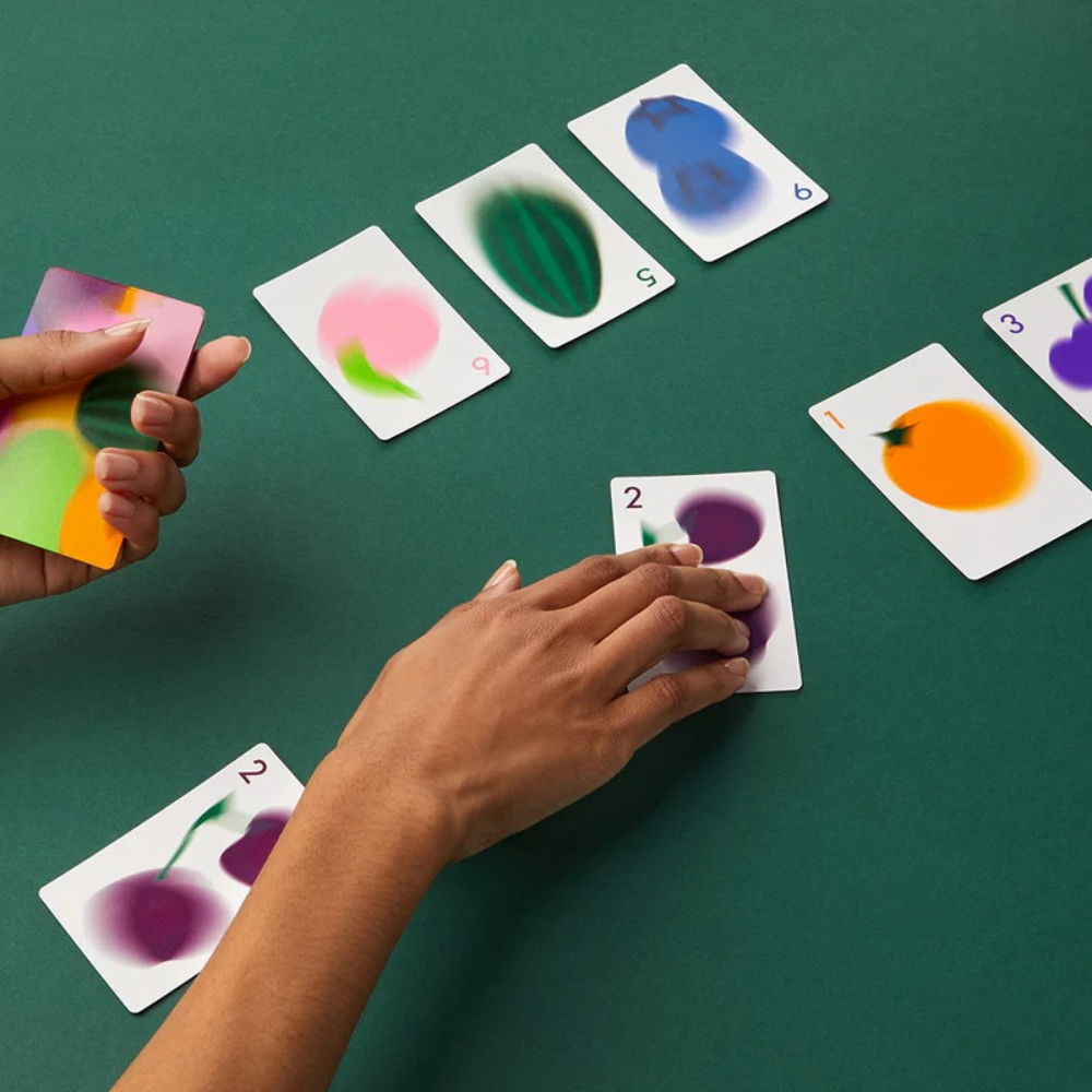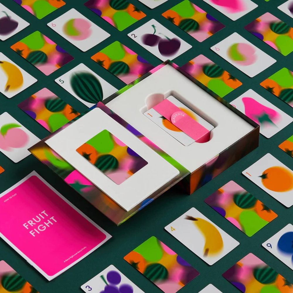 Fruit Fight is a press-your-luck game in which you draw cards to get points — but you don't want to draw too often because then you might lose all your gains!
