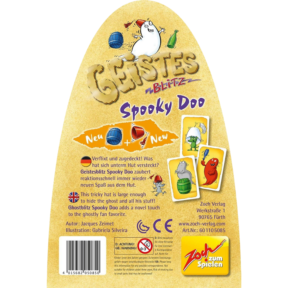 The lightning fast shape and colour recognition game that is sure to test the reflexes of kids, families and gamers alike. In Geistesblitz: Spooky Doo, five items sit on the table waiting to be caught. Each card in the deck shows pictures of two objects, with one or both objects coloured the wrong way. With all players playing at the same time, someone reveals a card, then players grab for the "right" object – but which object is right?