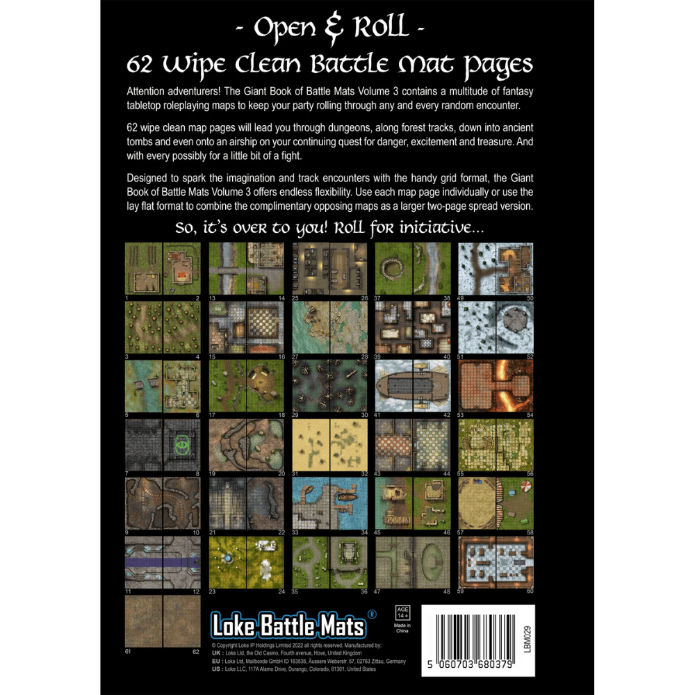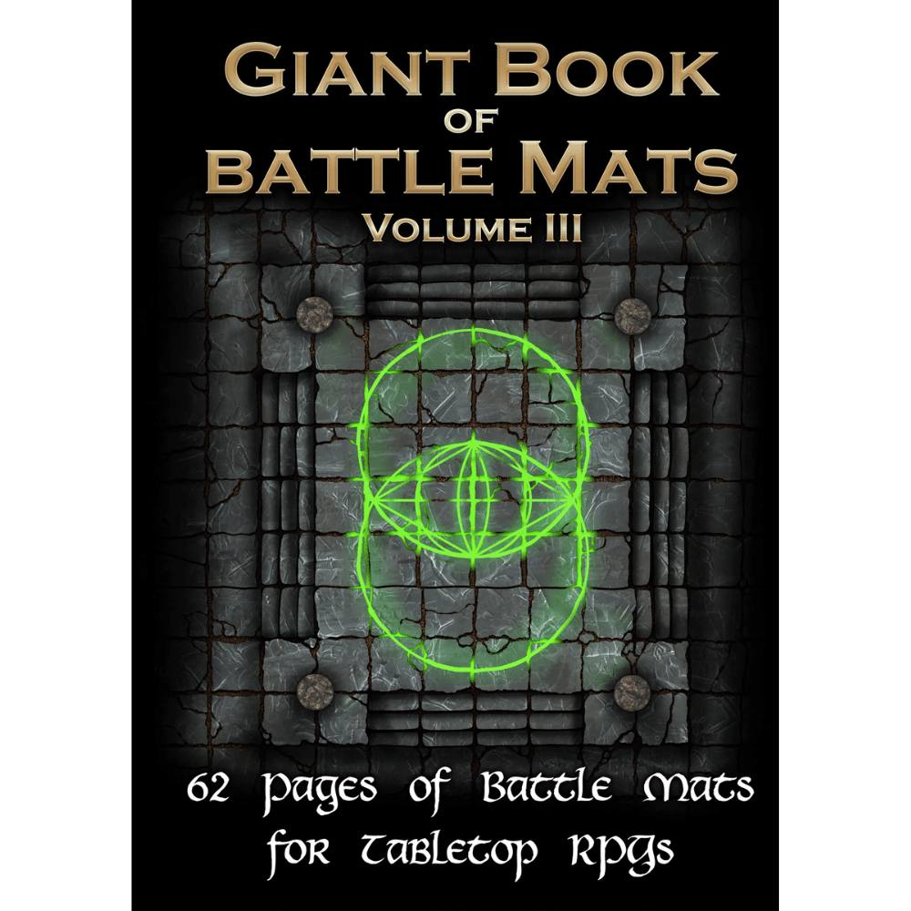 The Giant Book of Battle Mats Volume 3 is a book of huge RPG battle maps for tabletop roleplay games. This lay flat book of wipe clean lay flat maps cover a wide range of fantasy settings.