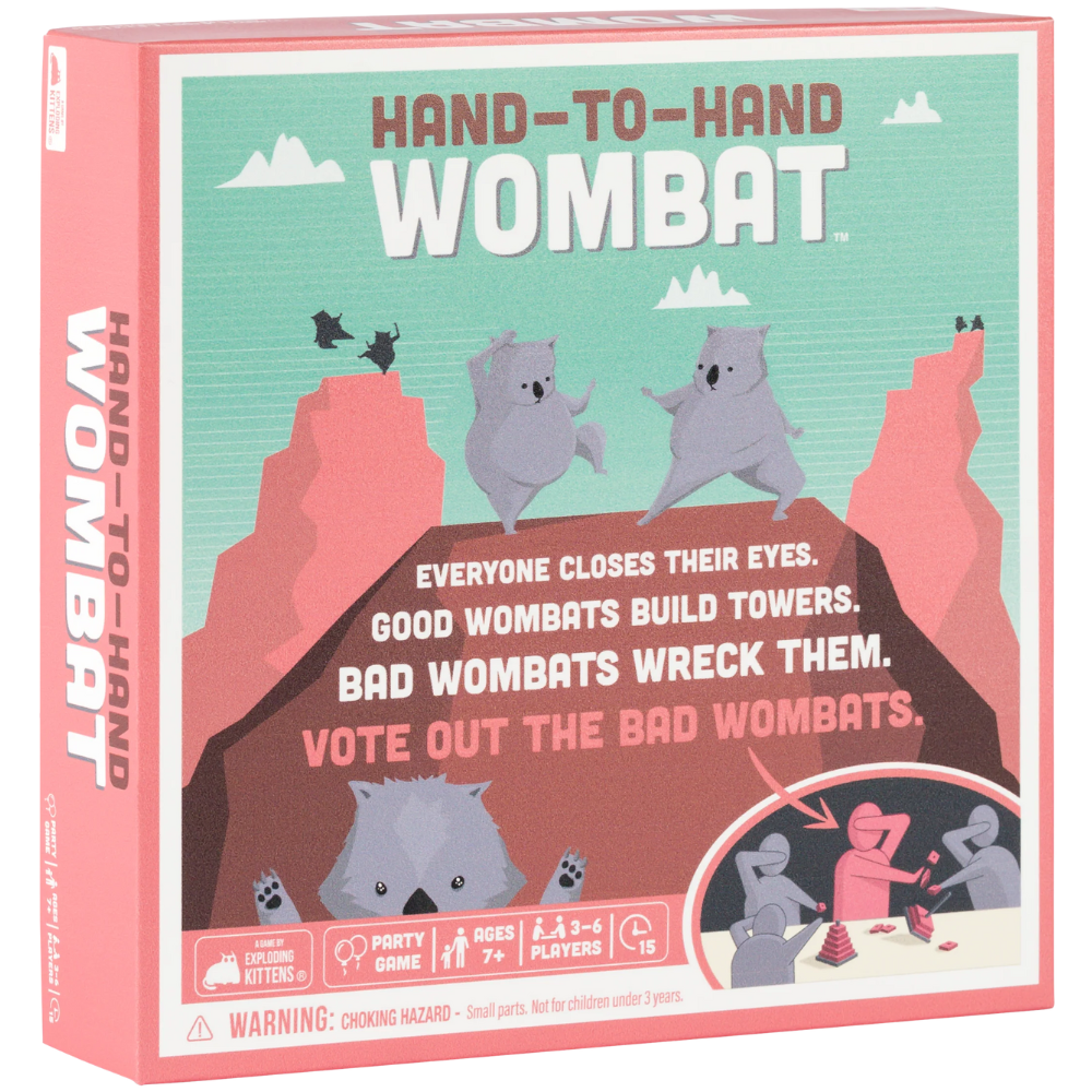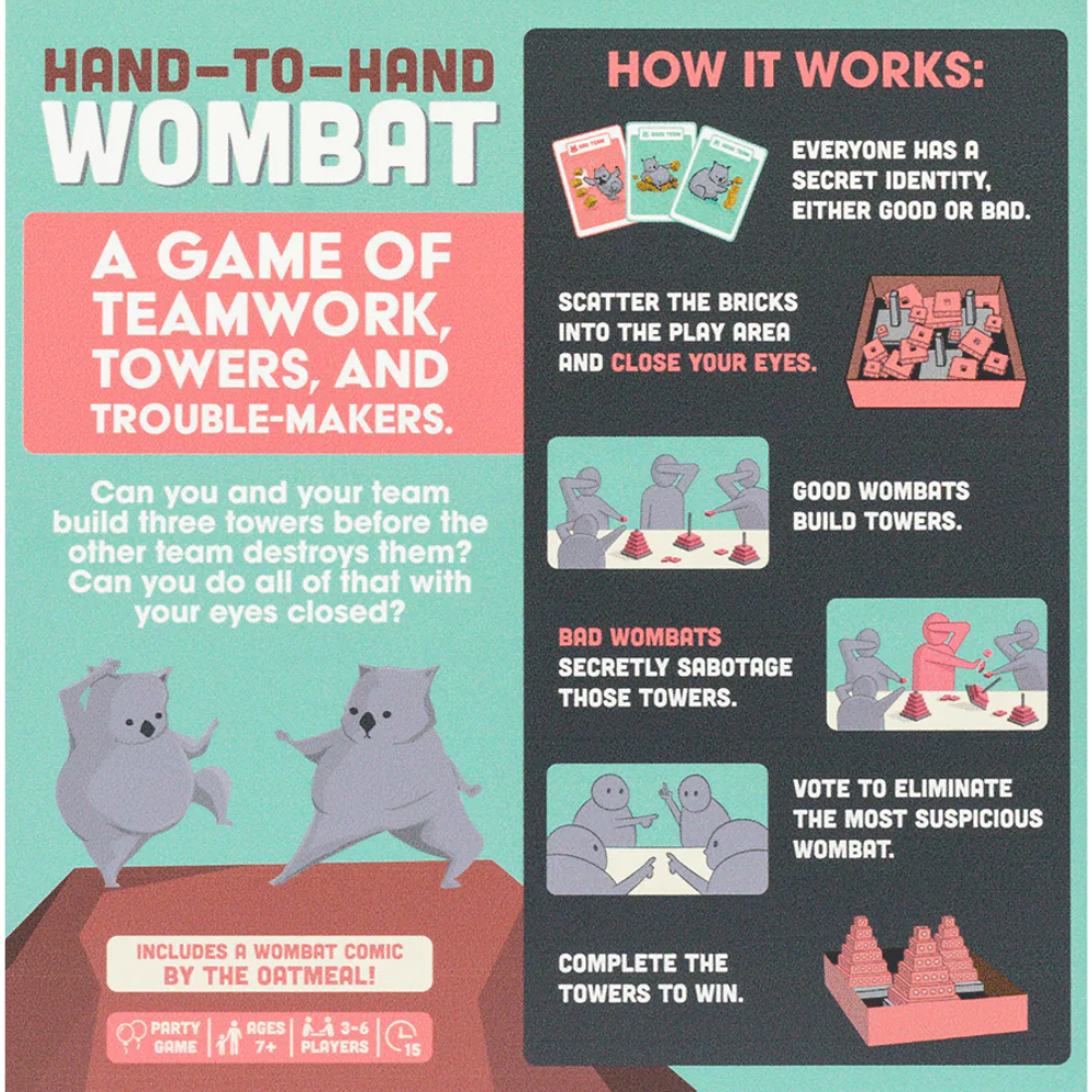 To play Hand-to-Hand Wombat, you’re each given a secret identity as a Good Wombat or a Bad Wombat, then everyone closes their eyes. Good wombats build towers; Bad Wombats try to mess with those towers. After the timer is up, everyone opens their eyes and discusses, argues, and votes on who they think is a Bad Wombat.
