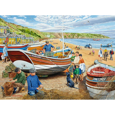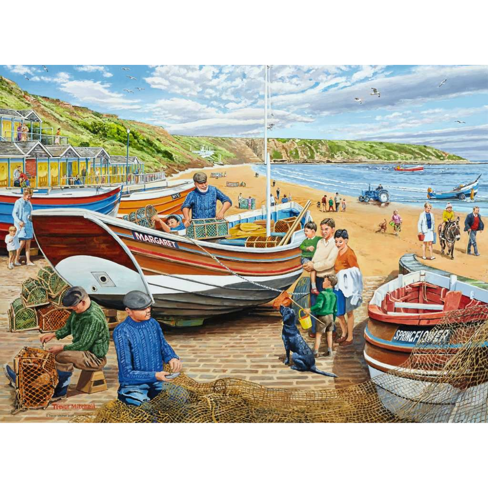 It’s a bright day on the beach at Filey, with local fisherman making the most of the good weather and repairing their nets and preparing for the next fishing trip. Further down the beach another boat is being brought up to shore, a kiddie is enjoying a donkey ride and families stroll along the sand.