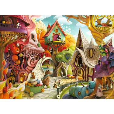 This is the kind of puzzle that makes you smile the moment you open the box. A whimsical village where every house seems to have its own personality – there's a pink swirled cottage that looks like it's been iced like a cake, a tree house perched perfectly in the branches, and what appears to be a pumpkin carriage waiting on the cobblestones.