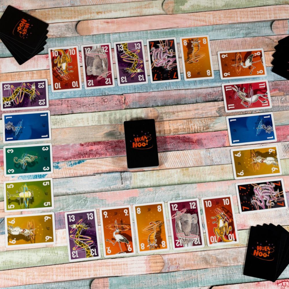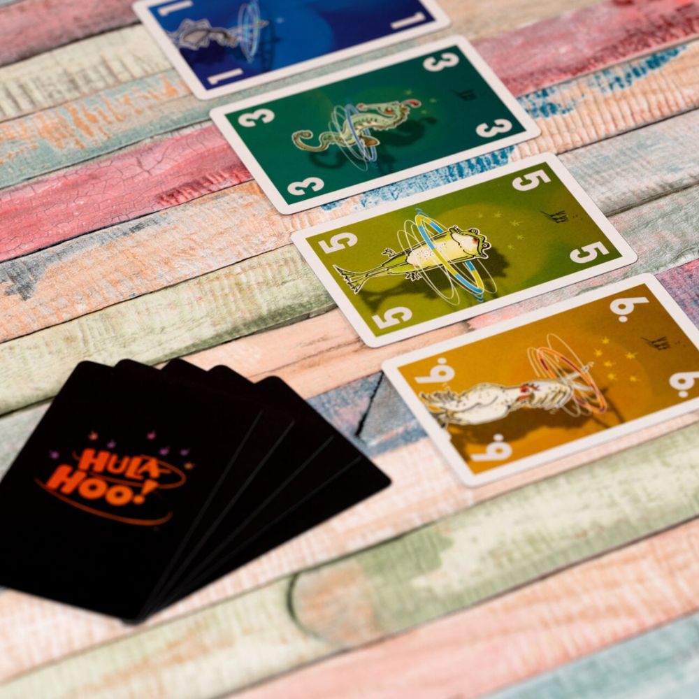 Each player starts with five cards in their hand, plus five cards openly in front of them. When it's their turn, they can choose to play one of their open cards or one from their hand. The first player plays any card and demands the next player to play "higher" or "lower". A player can follow this, or "double" - play the same card as the player before them. Then everyone has to double (or break the double with a neighbouring card or a joker. A player who cannot play drops their hoop and is out of the round.