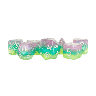 Layered Stardust dice are beautiful layers of resin mixed with colour-changing Stardust glitter. These are full-sized 16mm polyhedral dice sets that come with 7 dice (d4, d6, d8, d10, d10%(00-90), d12, and d20).