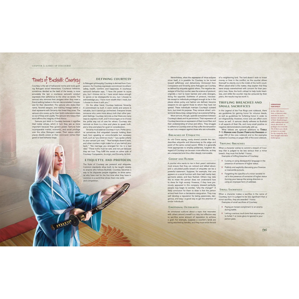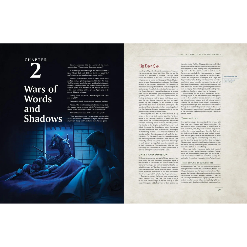 - GM support including guidance on running intrigue and romance-themed adventures, rules for creating one’s own court, and tips for engaging shinobi characters in games.