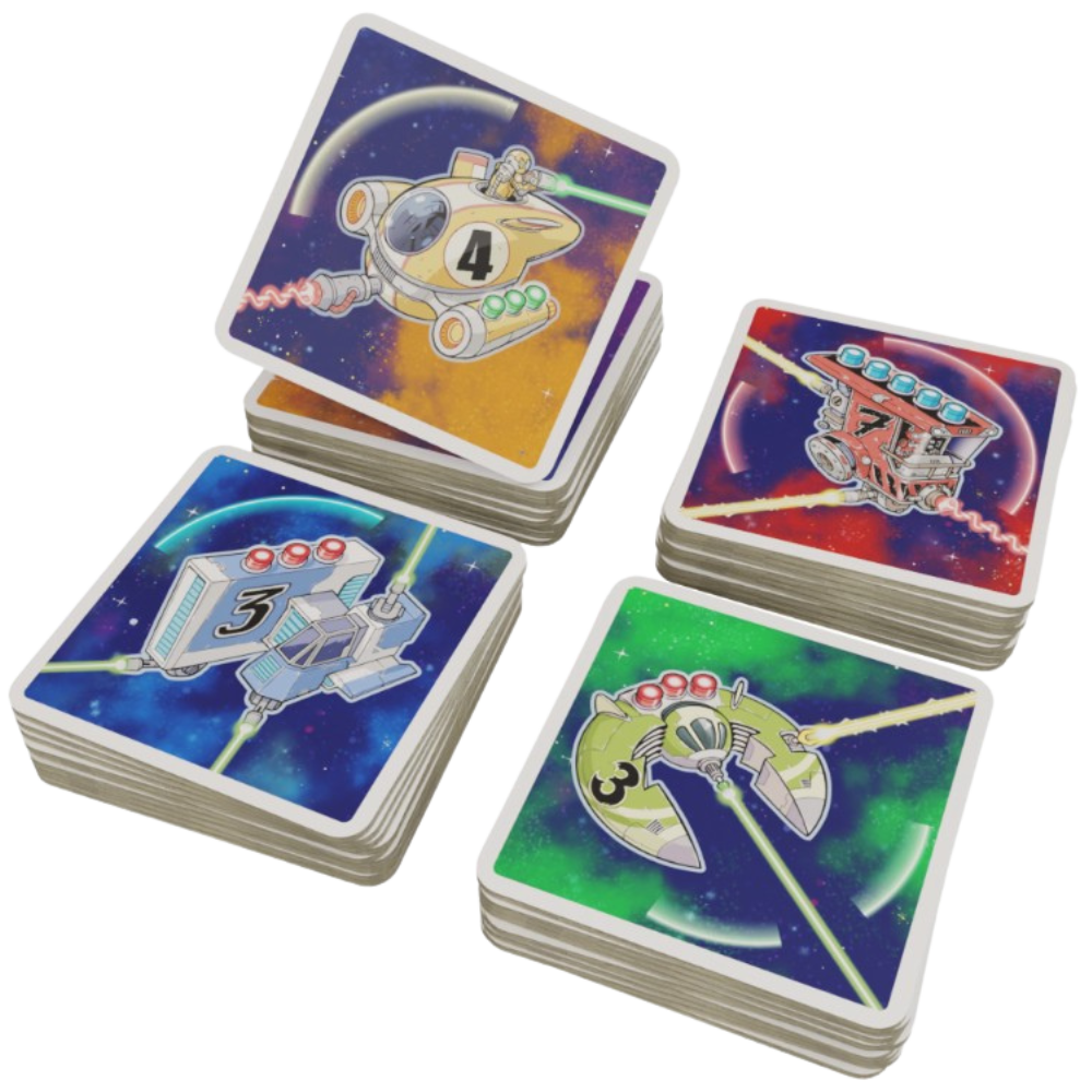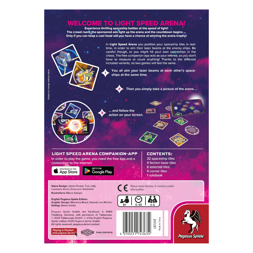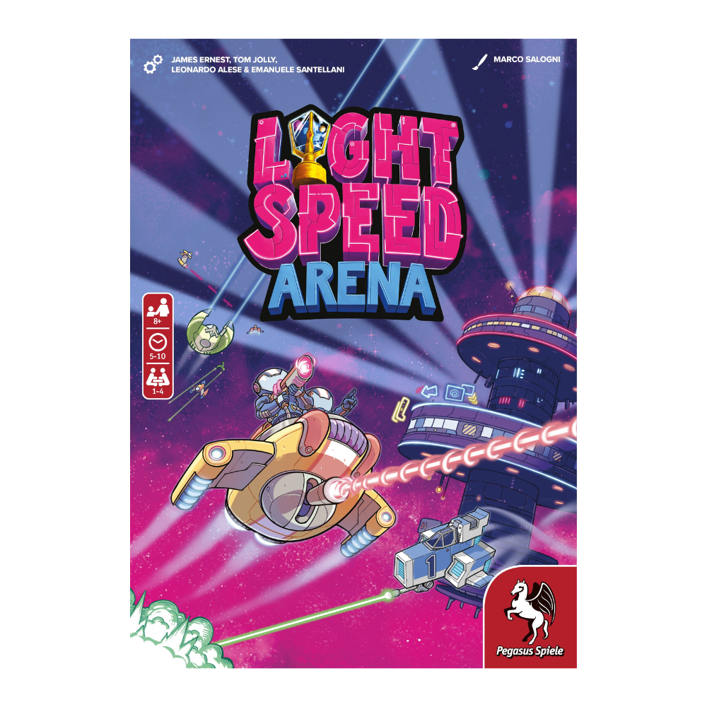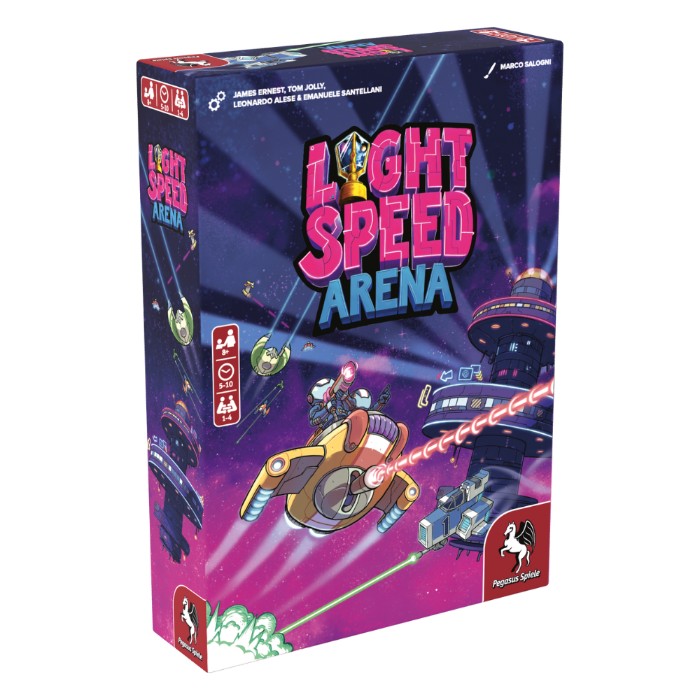Light Speed Arena is a fast-paced game of interstellar combat that requires fast reflexes and skilful precision. Over multiple 10-second rounds, players will simultaneously place their spaceship tiles freely in a defined area on the table. The goal is to quickly position the weapons and shields of the tile being placed to cause the most damage to their opponents while also protecting their own ships from incoming laser blasts. The arena will grow more chaotic as it fills with enemy ships, asteroids, and threats from all sides. Who can aim accurately, collect minerals and score the most points in the end?