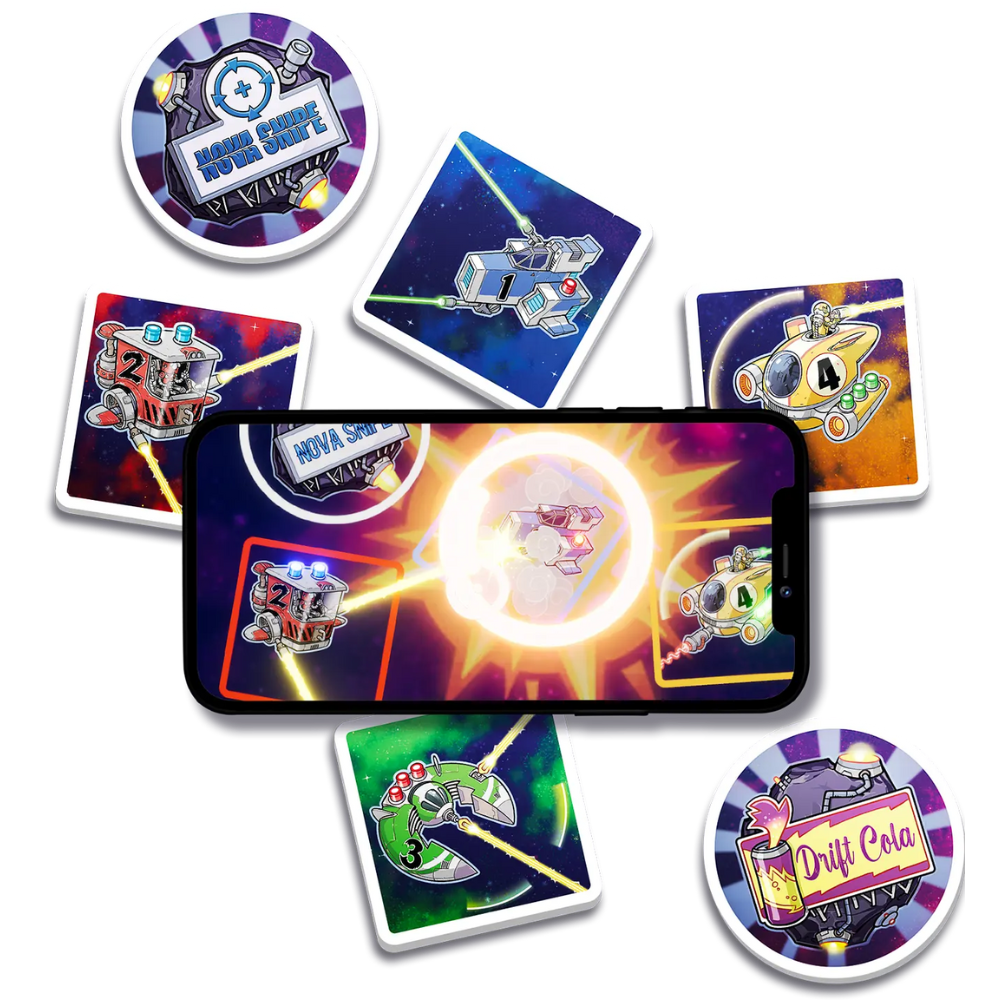 After all ships have been placed, players use the accompanying app to instantly scan the playing field, capturing the exact positions and orientation of everything on the table. Damage is automatically recognized and tracked, in addition to destroyed ships and any resources collected from asteroids. With the Scan&Play mechanic, players will see the results straight away on the screen, so there's no need for time-consuming end-game scoring. Whoever has the most points in the end will wow the crowd and leave the arena as the winner!
