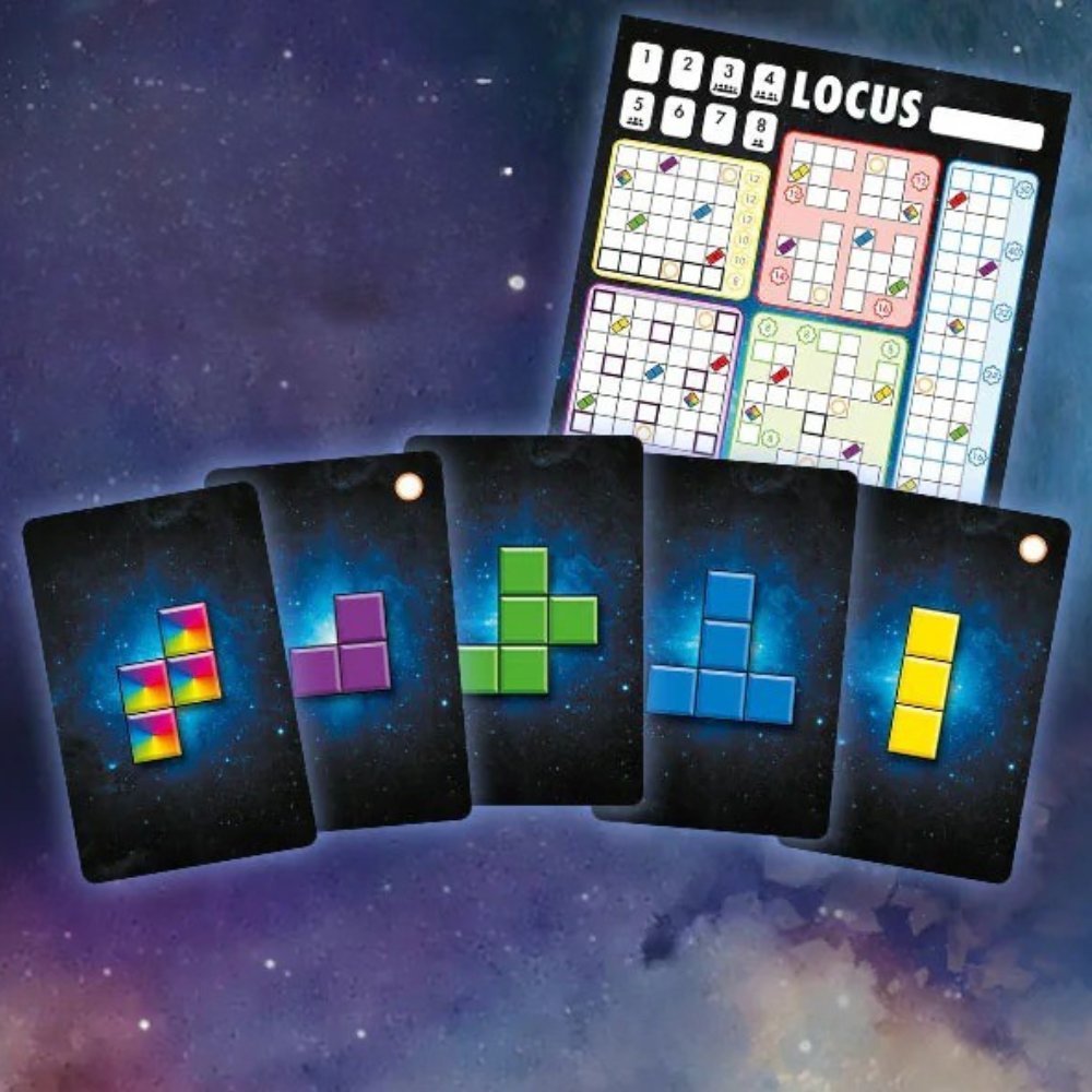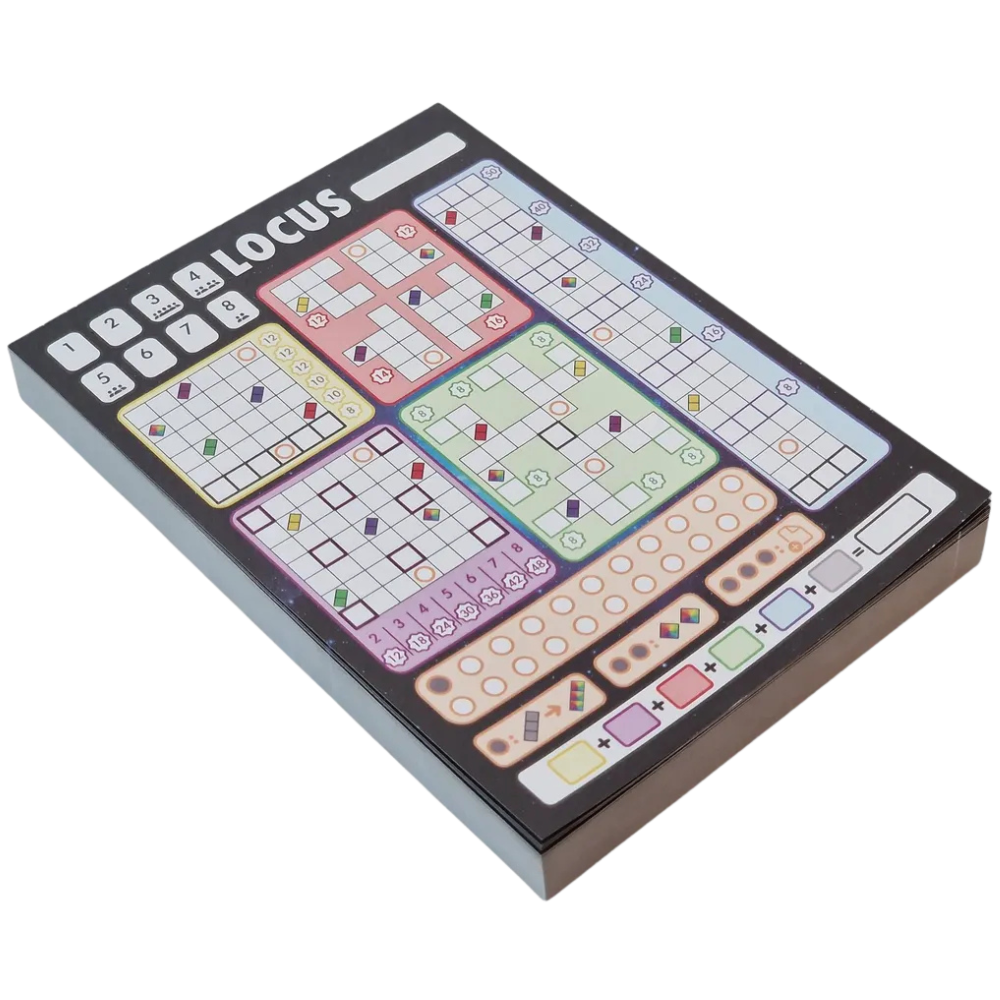 In Locus, every shape placement is a strategic puzzle! Each round, players reveal a set of shapes, then take turns drafting the one that best fits their grid. Choose carefully–each scoring zone/colour rewards different placements, and smart strategy will maximise your points! Rotate, mirror, and fit polyomino shapes, unlock powerful moves, and adapt as the grid fills up.