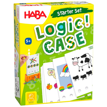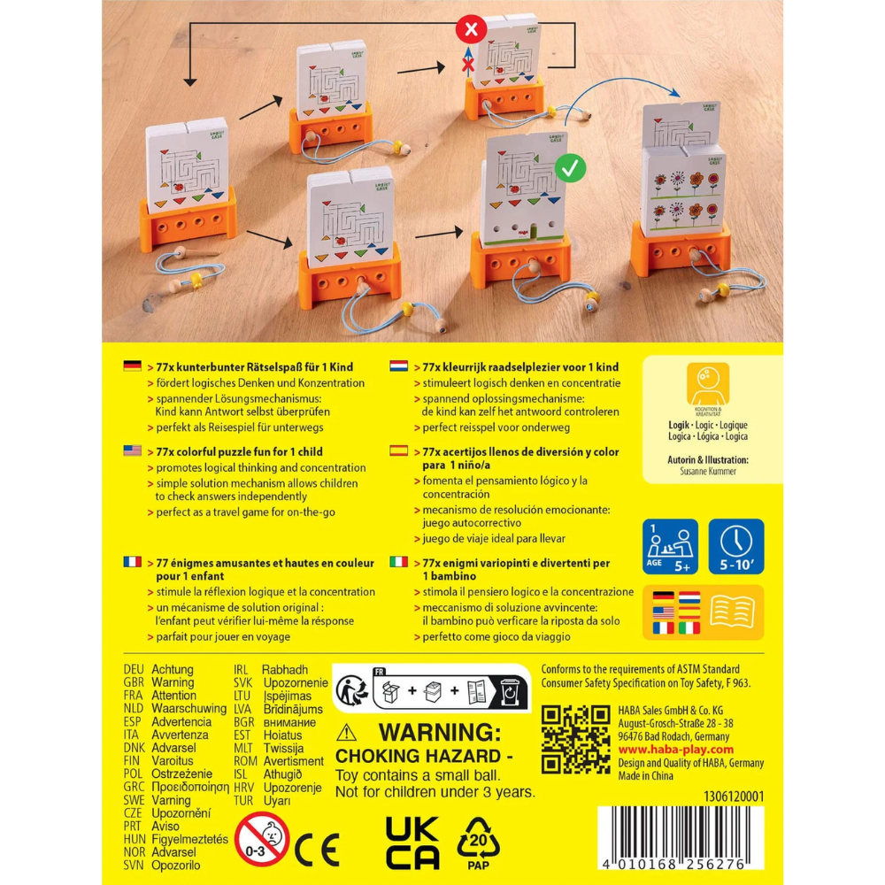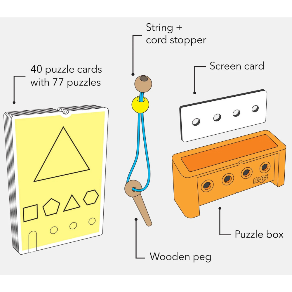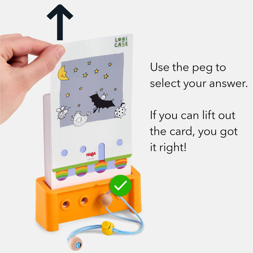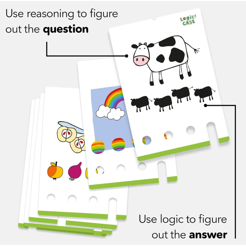 The goal is to solve a wide range of different puzzles. All puzzles are purposely visually depicted to promote inferential thinking through play. Children can check whether or not their answer is correct using the included wooden peg. Can the card be pulled out or not when they put in their answer? This allows and motivates children to solve the problems independently.