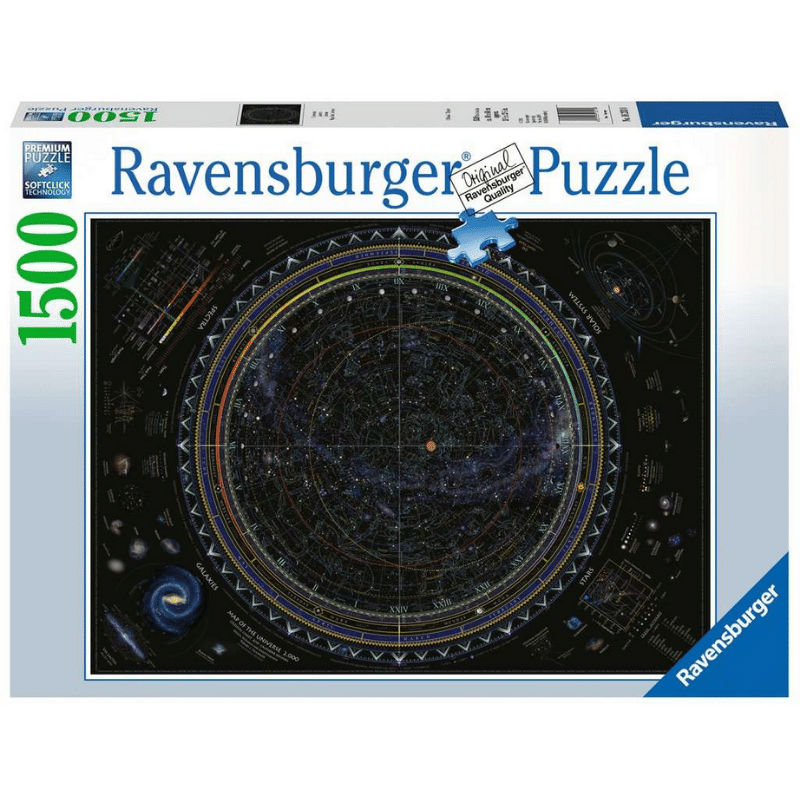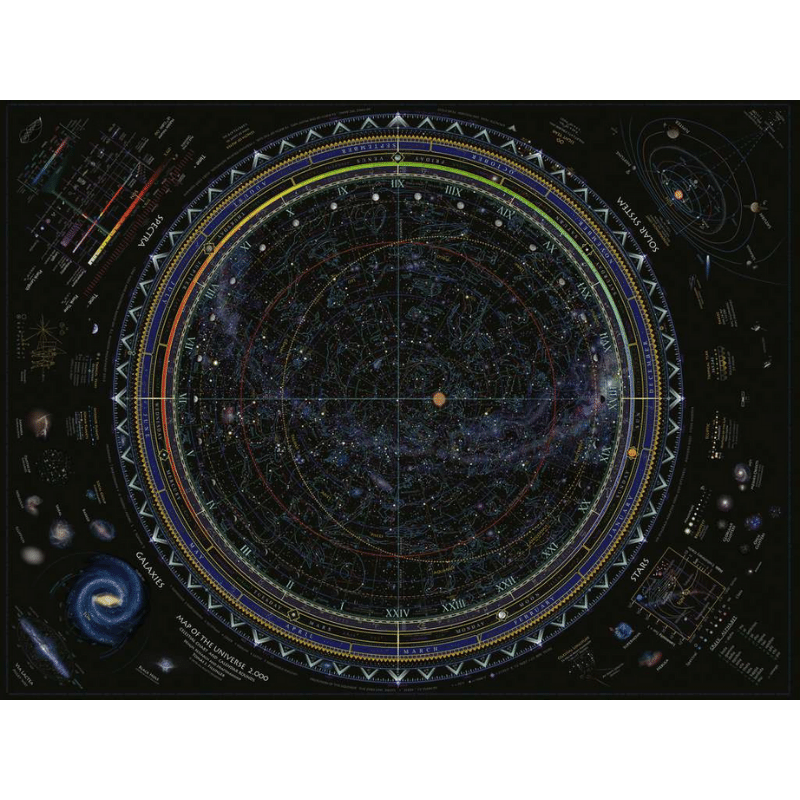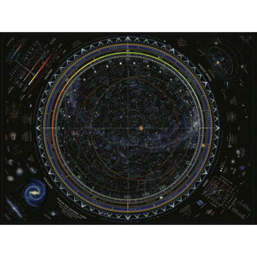 Complex and challenging map of the Universe. This wonderful map reveals just how crowded our Universe is. As you piece together the puzzle, discovered details of galaxies, solar systems, stars and constellations. The simple colour palette and complex design will give you a stellar puzzling challenge!