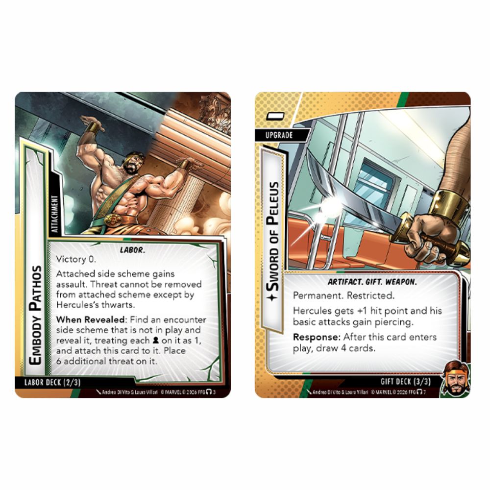 He is a man known by many names. Born Alcaeus, renamed Herakles, then—to distance himself from Hera—he was renamed again to Hercules. Now, his friends just call him Herc. This son of Zeus has had a tumultuous relationship with Olympus throughout his long life; sometimes he is their glory, other times their disgrace. But no matter what, there are few problems that he doesn’t first try to solve with his immense, godlike strength. Now, the mighty hero Hercules muscles into your games of Marvel Champions: The Card Game! With his immense strength and his ability to take on herculean tasks in exchange for mighty rewards, Hercules is a unique and powerful hero worthy of the fame his name brings. In this hero pack, you’ll find Hercules, his fifteen signature cards, his special side decks of gifts and labors, and a full assortment of Leadership cards inviting you to lead his fellow Avengers into battle.
