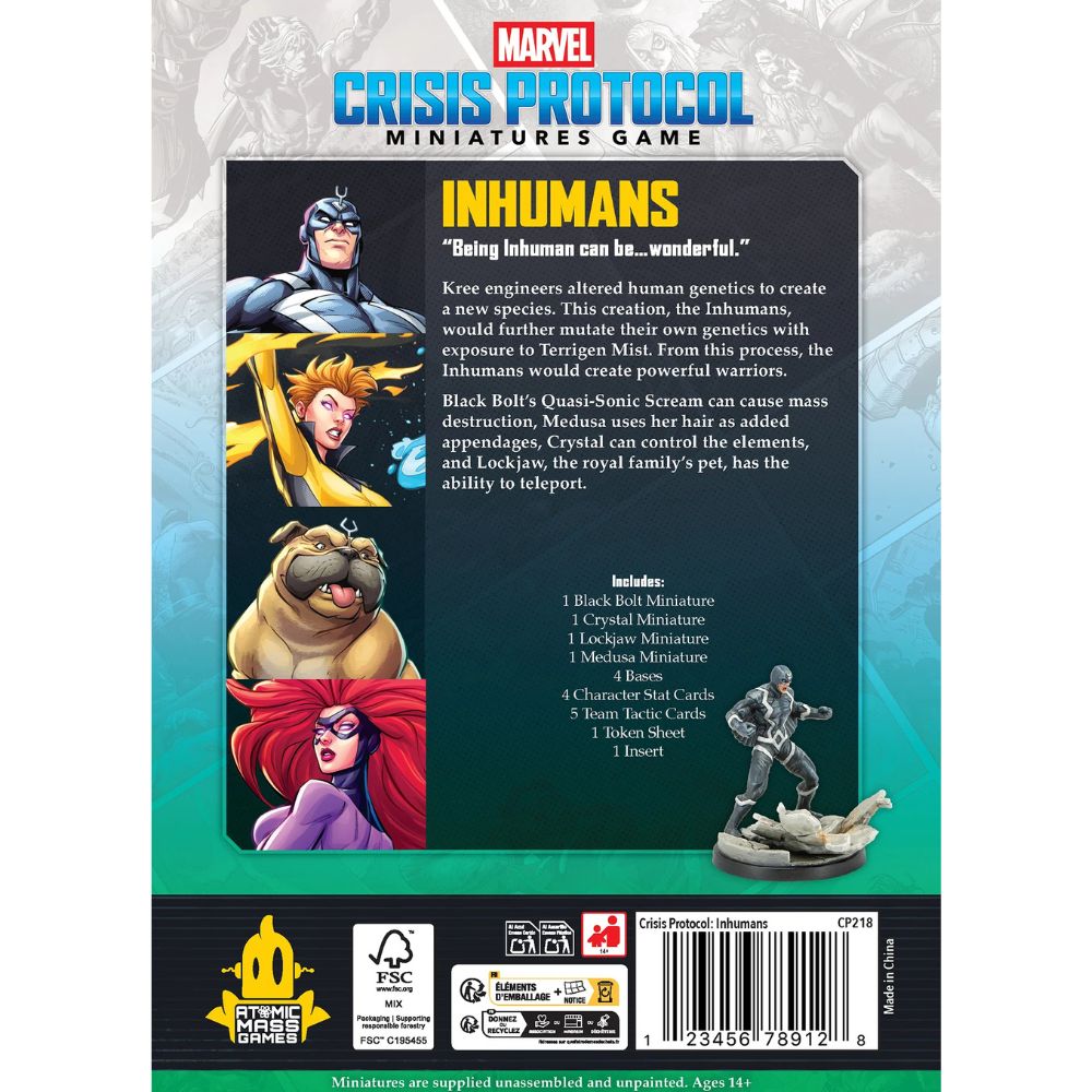 - JOIN THE INHUMANS AFFILIATION: Expand your Marvel: Crisis Protocol roster with Black Bolt, Medusa, Crystal, and Lockjaw—four of the most iconic members of the Inhuman Royal Family.