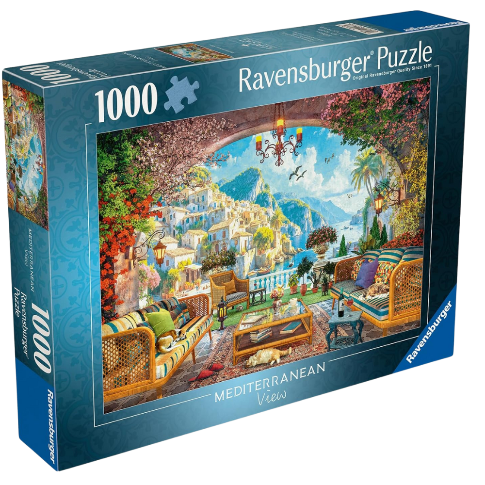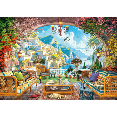 Experience the sun-soaked beauty of the Mediterranean with this stunning 1000-piece jigsaw puzzle, featuring a breathtaking terrace view. Overlooking a vibrant blue sea, the scene is framed by lush greenery and blooming flowers. The terrace, adorned with classic Mediterranean details, invites you to relax and take in the sweeping vistas of the coastal landscape.