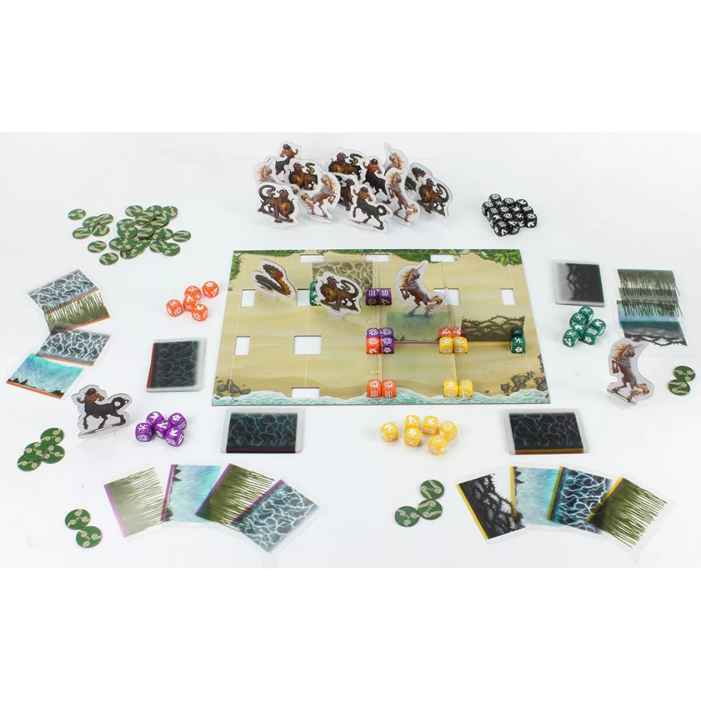 In the tournament held on a remote isle, mages use magical seeds and their own sorcery to create fences of natural elements to enclose and capture various beasts. As one of the competing mages, you use your share of eighty custom dice as seeds to hold semi-transparent cards that represent fences of bamboo, lightning, thorns, and water. Use these fences to capture magical beasts: chimeras, unicorns, basilisks, and centaurs. The magician who has the most points for capturing beasts and building fences wins the tournament and becomes the Champion of Magic thanks to Merlin's Beast Hunt!